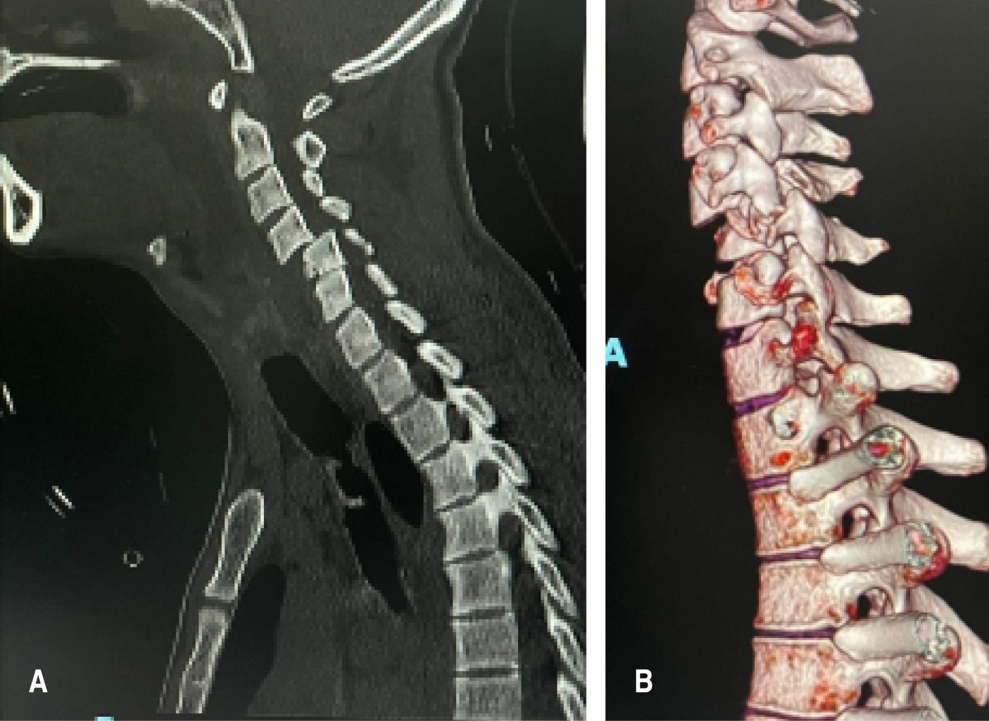 Posterior a la adecuada instauración del apoyo vital avanzado en trauma (ATLS), los pacientes con sospecha de traumatismo cervical subaxial deberán someterse a pruebas de detección por imagen. Siendo de manera inicial necesarias las proyecciones radiográficas en posición anteroposterior, lateral y transoral para la evaluación de la columna cervical, abarcando desde la unión craneocervical hasta la primer torácica, obteniendo una visualización clara de la unión cervicotorácica, ya que las fracturas de C7 y la fractura-luxación de C7-T1 representan casi 17% de las lesiones de la columna cervical. Se deberá prestar atención en la alineación de la columna cervical, altura del disco o cambios en las distancias interespinosas. A pesar de ser un estudio práctico y accesible, recientes estudios han demostrado que la radiografía simple tiene sólo apenas entre 30 y 60% de sensibilidad para evaluar lesiones y fracturas a este nivel. El uso de proyecciones en flexión-extensión para evaluar la estabilidad de los ligamentos se ha cuestionado por la dificultad de la obtención y el advenimiento de otros estudios superiores para evaluar integridad ligamentaria, por lo tanto, son mínimamente útiles en situaciones agudas. La tomografía axial computarizada, considerada como el caballo de batalla de las imágenes traumáticas en la columna, presenta ventajas con respecto al uso de imágenes radiográficas u obtenidas por resonancia magnética, entre las cuales tenemos la facilidad de realización, rapidez, equipos propensos a sufrir menos fallas técnicas, asegurando así una mayor precisión diagnóstica, ya que ofrece una excelente visualización de las uniones cervicotorácica y occipitocervical, que a menudo son de mala calidad en las radiografías simples. En algunos estudios se ha demostrado sensibilidad de 99% y especificidad del 100% con el uso de la tomografía axial computarizada multiplanar. Sin embargo, con la limitante en la identificación de lesiones puramente ligamentarias, en la cual la resonancia magnética cuenta con una alta sensibilidad y especificidad con tasas reportadas de 91 y 100%, respectivamente. Sin embargo, dicho estudio también tiene una alta tasa de falsos positivos; además, los hallazgos positivos en la resonancia magnética sugestivos de lesión ligamentosa en aquellos con resultados negativos por medio de tomografía axial computarizada rara vez requirieron intervención quirúrgica (Figura 1).6-8