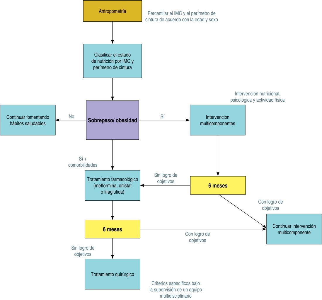 Para ser considerado candidato a tratamiento farmacológico, el adolescente deber haber fracasado en una intervención de control de peso por equipo multidisciplinario, que incluya cambios en el estilo de vida (plan de alimentación y ejercicio) de al menos seis meses, o en el caso de presentar alguna complicación como diabetes mellitus, dislipidemia, síndrome de ovario poliquístico (Figura 1).1,2