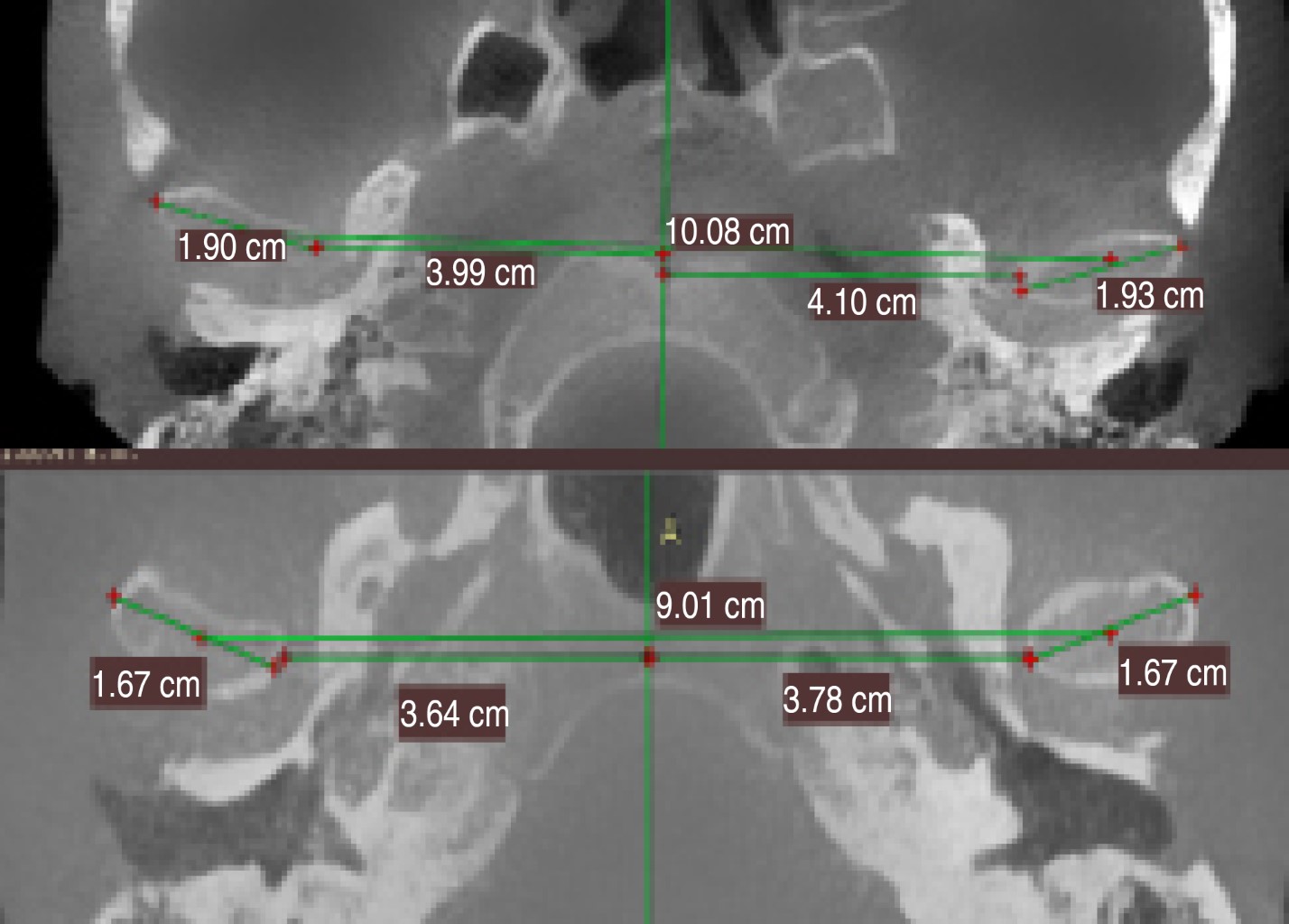 Para la obtención de las tomografías se utilizó un equipo único tomógrafo de haz cónico WhiteFox 105 kVp, 16 mA, X-RayTube OX/110). Una vez obtenidas las imágenes se procede a realizar las mediciones de tomografía computarizada. Todas las tomografías computarizadas fueron posicionadas, con el plano horizontal de Frankfort (PF) paralelo al suelo y fueron analizadas por un solo evaluador y el análisis estadístico descriptivo por un operador único. Se evaluaron en dos tiempos: T1: prequirúrgico, y T2: postquirúrgico (hasta una semana después de la cirugía).