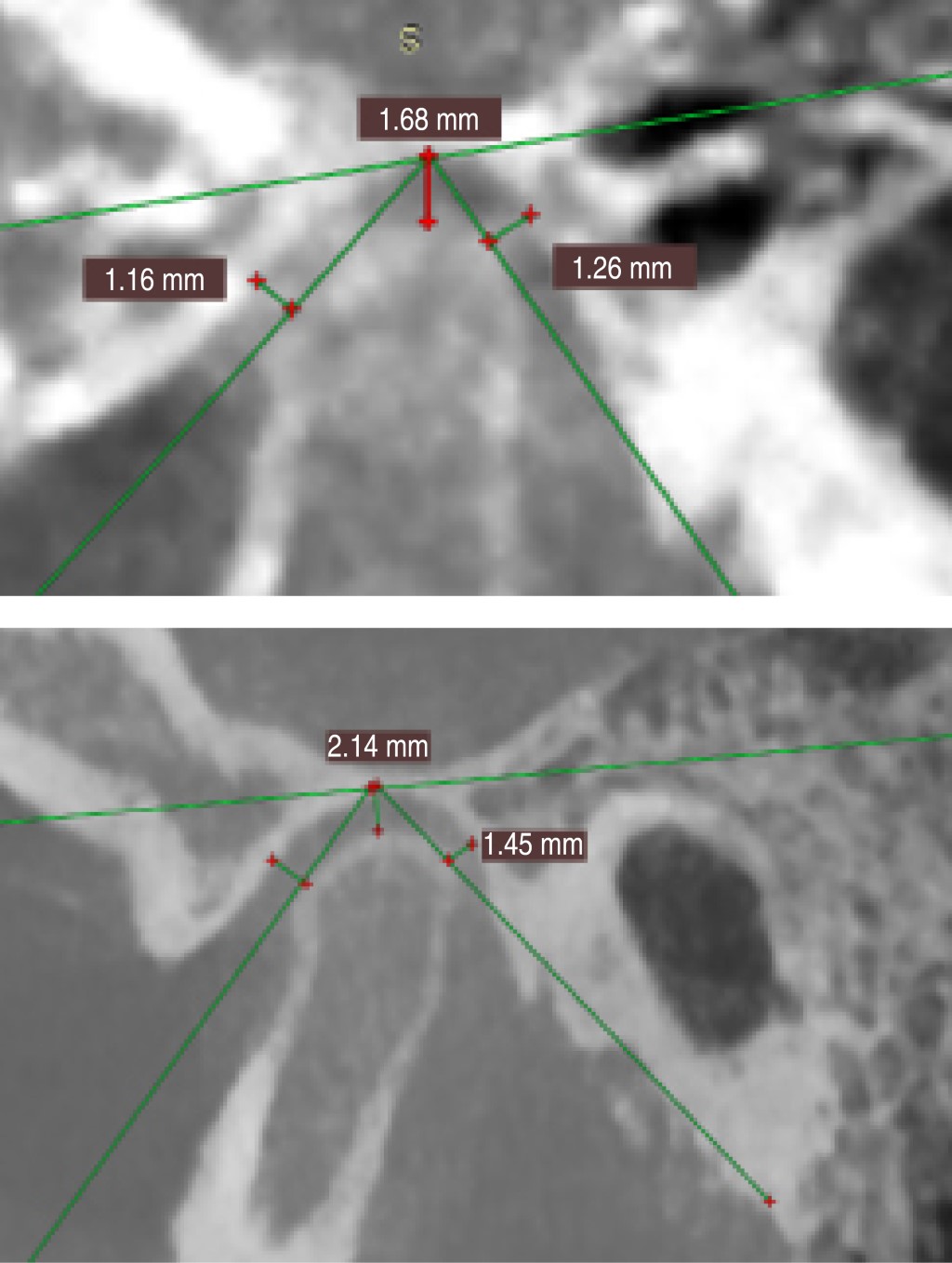 Corte coronal: para evaluar el espacio articular medial (EAM), se tomó la distancia desde el punto más prominente de la superficie medial de la cabeza condilar hasta la superficie ósea de la fosa glenoidea (Figura 3).