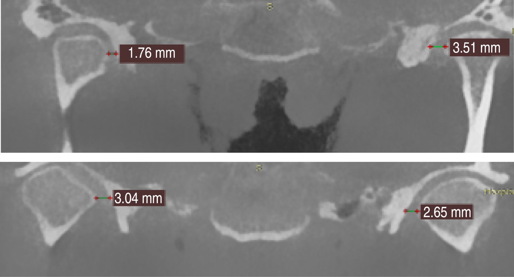 En sentido latero-medial, los desplazamientos no son reproducibles. Las ATM son estructuras que operan juntas, unidas por un solo hueso; sin embargo, ellas pueden estar sujetas a diferentes cantidades de estrés, que puede resultar en un proceso de remodelación ósea específica para cada cóndilo. En dos casos se evidenció la existencia de diferencias significativas en la distancia intercondilar (a nivel total) promedio: lado derecho e izquierdo de los pacientes que fueron objeto de osteotomía bimaxilar (p = 0.012, es decir, p < 0.05), lo que se correlaciona con el aumento del espacio articular medial.