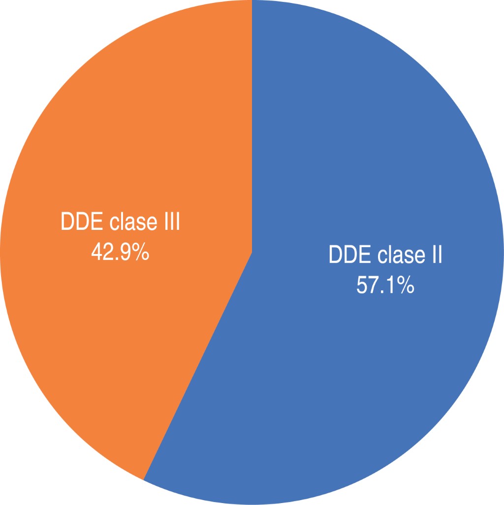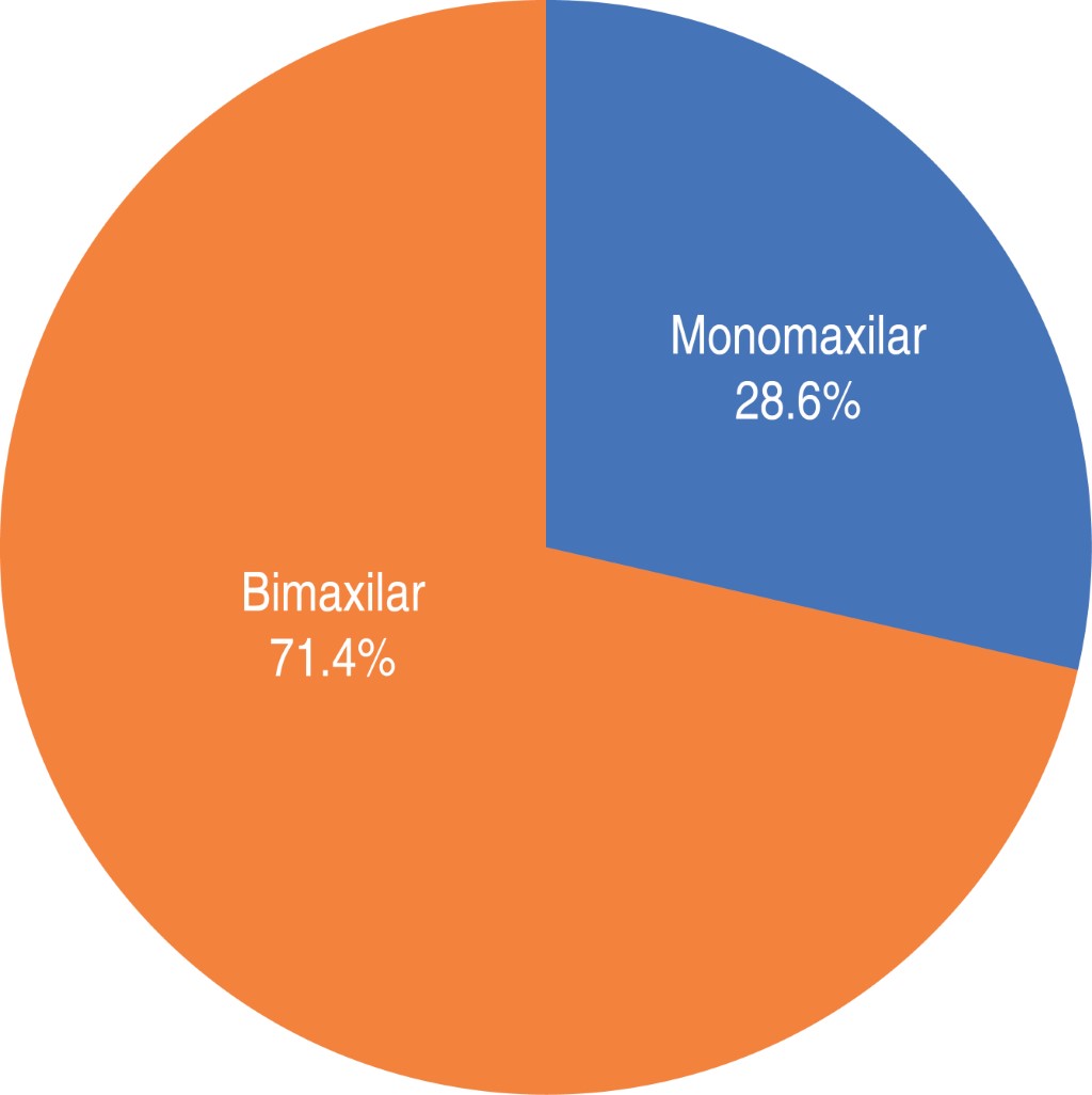 Se evidenció que ocho (57.1%) presentaron DDE clase II, dos (25%) hombres y seis (75%) mujeres. Por otra parte, los seis pacientes restantes fueron diagnosticados con DDE clase III (42.9%): cuatro hombres y dos mujeres; los hombres tenían: 18, 23, 25 y 30 años y dos mujeres tenían: 18 y 22 años. En cuanto al tipo de intervención realizada, 10 (71.4%) de los casos fueron intervenidos de manera bimaxilar y cuatro (28.6%) monomaxilar. (Figuras 4 y 5, Tabla 1)