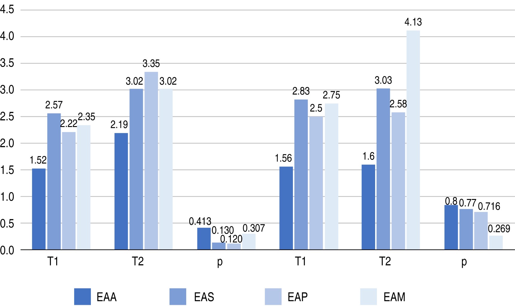 En el caso de EAS, EAA los lados izquierdo y derecho aumentaron en un promedio de 0.45 mm. En el caso del EAM de lado derecho aumentó en un promedio de 0.67 mm, mientras que el lado izquierdo aumentó en un promedio de 1.38 mm. En el caso de EAP lado derecho disminuyó en un promedio de 0.62 mm, mientras que el lado izquierdo dis- minuyó en un promedio de 0.3 mm (Tablas 2, 3, 4, 5, 6 y 7, Figura 6)