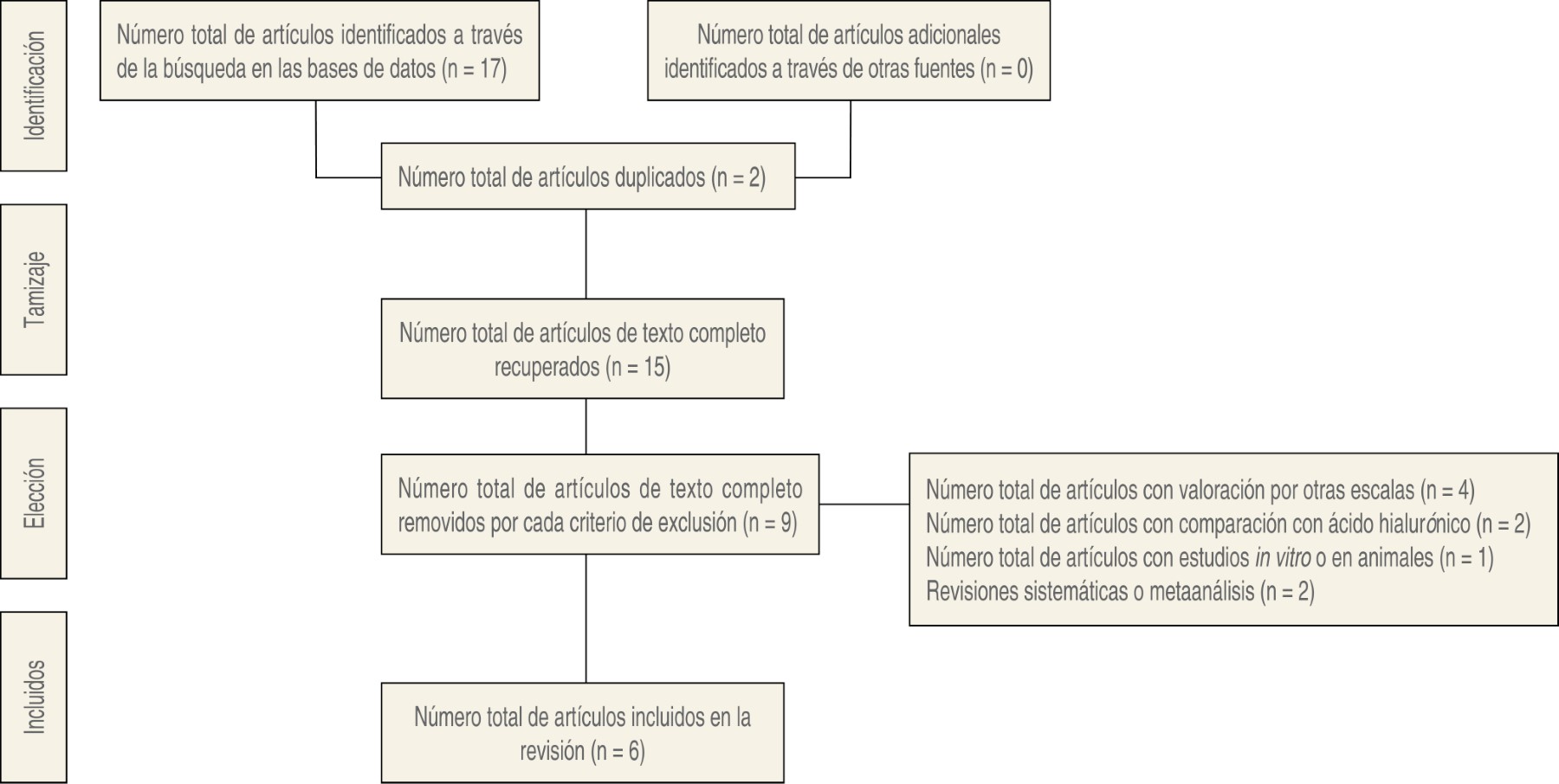 Se obtuvieron un total de 17 artículos que cumplieron los criterios de selección. Los resultados de la búsqueda de las fuentes electrónicas y la búsqueda manual se importaron en el software Rayyan para recopilar todas las referencias y eliminar duplicados. Se excluyeron aquellos estudios que compararon la aplicación de células mesenquimales con otras terapias intraarticulares, valoraron el dolor aplicando otras escalas, realizaron estudios in vitro o en animales. Dando un total de seis ensayos clínicos aleatorizados (Figura 1).