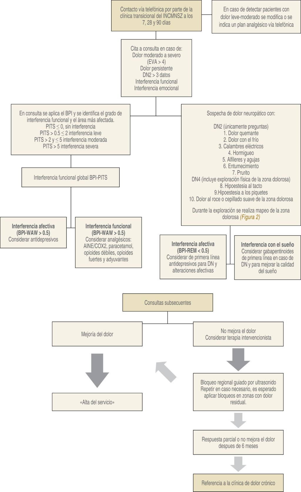 En los resultados preliminares de este trabajo de investigación, identificamos que síntomas específicos detectados con el DN2, como el dolor por frío, hormigueo, sensación de agujas, toque eléctrico y entumecimiento, están significativamente asociados con la interferencia funcional. Estos hallazgos resaltan la importancia de una evaluación completa y temprana del dolor postoperatorio, especialmente en relación con el dolor neuropático, que requiere un enfoque específico para mitigar su interferencia funcional y mejorar la calidad de vida a largo plazo durante la recuperación de los pacientes. A lo largo de este proyecto de investigación y el establecimiento de las clínicas de dolor agudo y transicional en el INCMNSZ, hemos concluido que un seguimiento riguroso desde el postoperatorio inmediato, incluyendo el contacto telefónico con los pacientes a los siete días, 28 días y tres meses, junto con intervenciones analgésicas tempranas, ofrece claras ventajas. La utilización del BPI para evaluar la interferencia funcional, el DN4 y la posibilidad de consultas para la exploración física y el establecimiento de un tratamiento temprano, demuestran ser superiores en comparación con el establecimiento del dolor crónico postoperatorio no reconocido, el cual puede comprometer significativamente la calidad de vida de los pacientes a largo plazo. Hemos observado que un tratamiento temprano puede lograr tener un efecto preventivo.