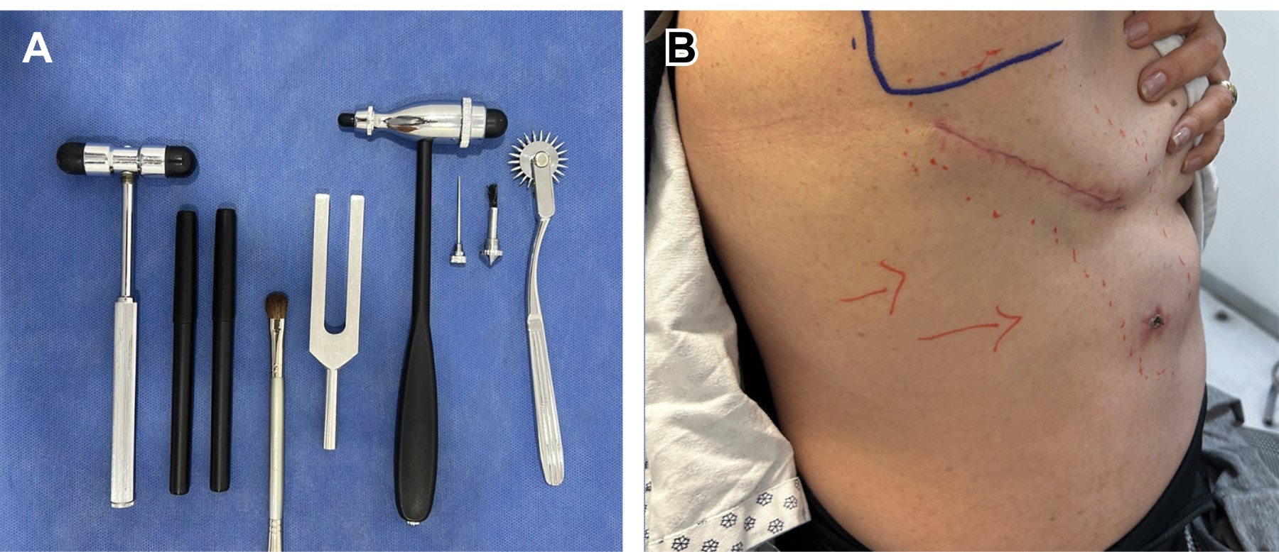 El dolor neuropático fue evaluado mediante el cuestionario DN4, las primeras dos preguntas exploran diversas características del dolor como quemazón, frío doloroso, calambres eléctricos y síntomas asociados como hormigueo, sensación de alfileres y agujas, entumecimiento y prurito. La aplicación completa del DN4 durante la consulta, recordando que las dos preguntas restantes requieren de exploración física. Es crucial prestar atención detallada al sistema somatosensorial, evaluando la respuesta al tacto, dolor, frío y calor para identificar áreas de hipoestesia mecánica y/o térmica, hiperalgesia o alodinia. La evaluación clínica puede ser realizada en cada consulta utilizando instrumentos simples como algodón, martillo de reflejos, rueda de Wartemberg, diapasones, compases de Weber, estesiómetros de aguja y filamentos de von Frey, entre otros. Durante la exploración física el mapeo en la zona dolorosa con una línea punteada representa alodinia o hiperalgesia y la línea continua representa zonas de hipoestesia (Figura 2). La repetición del mapeo de las zonas con alteraciones sensoriales en consultas de seguimiento puede revelar cambios somatosensoriales, aunque estos no siempre están directamente relacionados con la intensidad y gravedad del dolor neuropático. Se aconseja mapear estas zonas en diagramas esquemáticos del cuerpo anterior y posterior del paciente, para comparar en cada consulta, una posible respuesta al tratamiento neuromodulador (Figura 2).