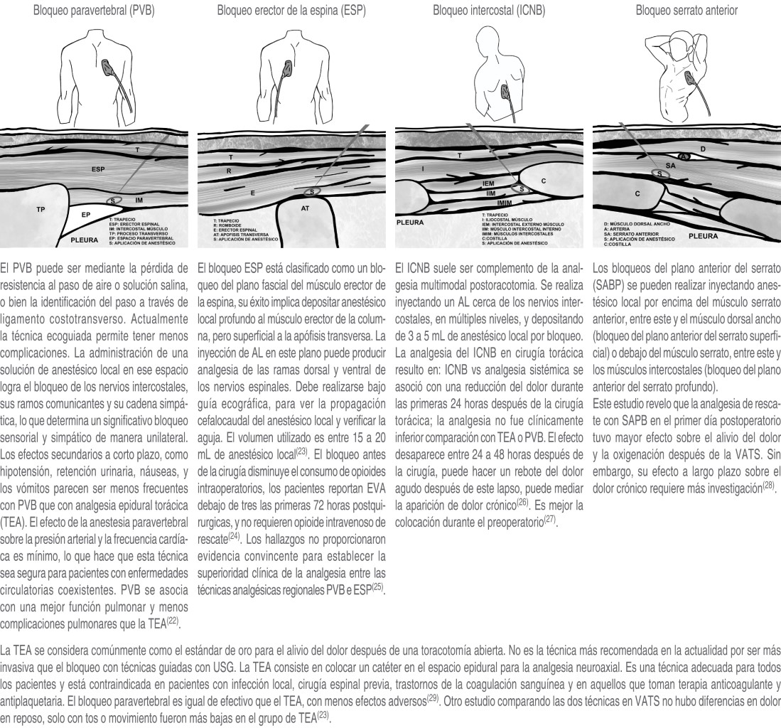Se describen las técnicas de bloqueos analgésicos para la cirugía de tórax (Figura 1).