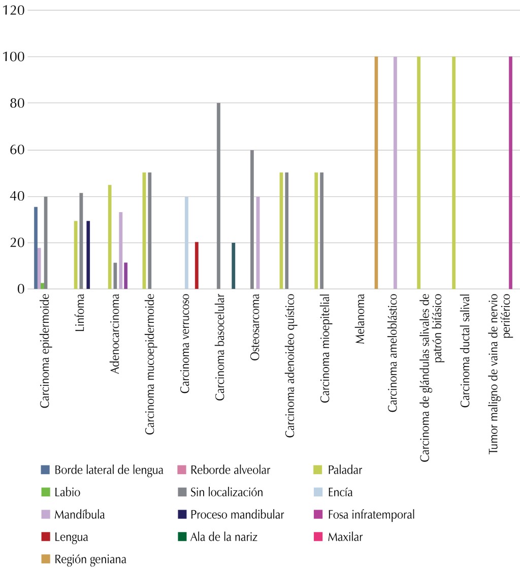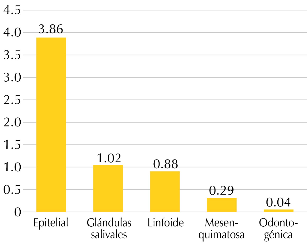 De acuerdo con la estirpe histopatológica las neoplasias malignas más frecuentes son las epiteliales, seguidas de las neoplasias malignas de glándulas salivales, las de tipo linfoide, mesenquimatosas y odontogénicas (Figura 2).
