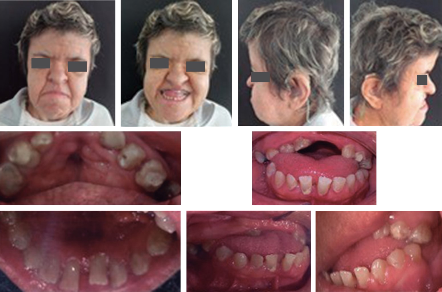 La paciente presenta retraso mental leve con deterioro del comportamiento, dificultad motriz, acrobraquicefalia, hipertelorismo, proptosis, piel pálida, implantación baja de ambos pabellones auriculares, disminución auditiva, sinoniquia/sindactilia, hipoplasia maxilar en forma de V y crecimiento general menor en comparación con sus hermanos. Los labios con forma curvilínea y gruesos, color rosa, consistencia blanda, textura granular y frenillos bien insertados, con vestíbulo de color rosado, presencia de endocitosis y poca profundidad, sin lesiones. El paladar duro con forma de bóveda arqueada, acortado en sentido sagital, rosa, más ancho de lo normal, con presencia de fisura (comunicación oronasal persistente) y fístula, esta última cubierta por un obturador removible de acrílico, paladar blando color rosa con buena movilidad y úvula bífida. La lengua saburral y fisurada, presencia de macroglosia, textura de toalla y zonas de atrofia papilar. Frenillo lingual corto. Piso de boca color rosado, presencia de glándulas salivales mayores y textura granular, dientes con coronas pequeñas (Figura 1).