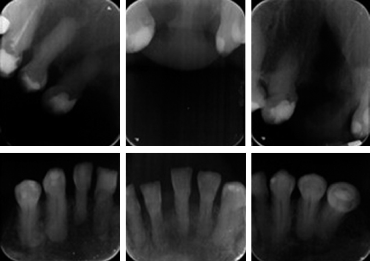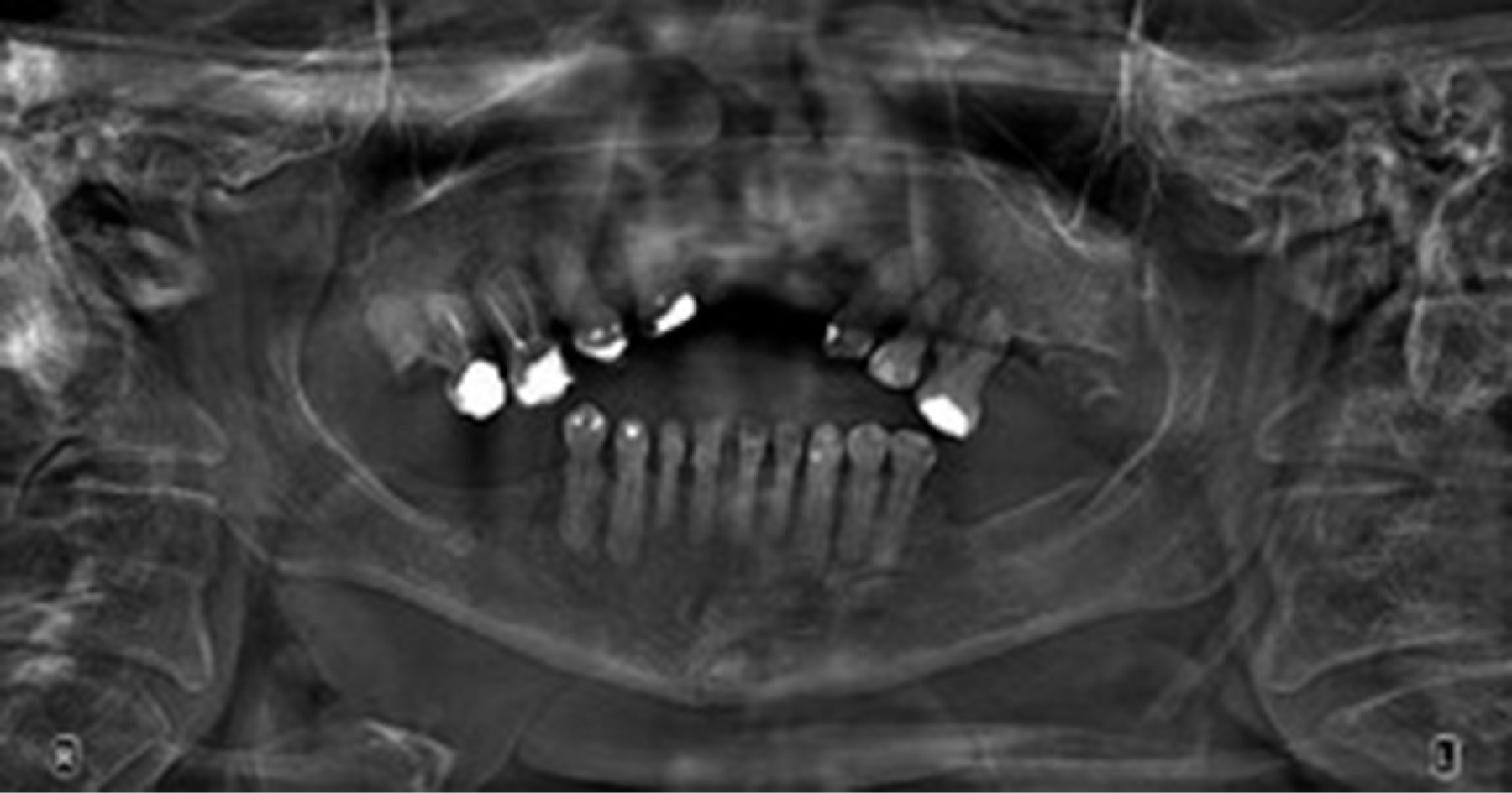 Radiográficamente se observó anodoncia parcial, caries y restauraciones defectuosas/mal adaptadas, pérdida de hueso horizontal y/o vertical en todos los sextantes, cráteres óseos, paladar hendido, hipercementosis en todos los dientes, raíces enanas, fracturas coronarias, seno y membrana maxilar pequeña, alteración de la articulación temporomandibular y restos radiculares (Figuras 2 y 3).