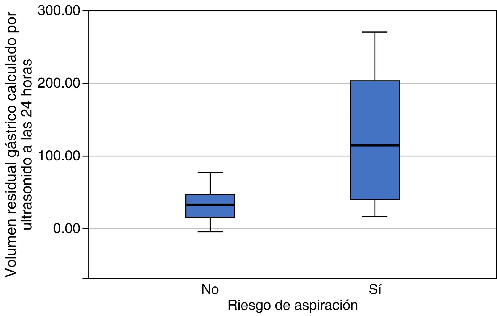 Al ingreso, el promedio del volumen residual gástrico (VRG) medido fue 3.8 ± 8.8 mL y el valor promedio del volumen residual calculado por ultrasonido fue de 15.12 ± 16 mL. A las 24 horas, el promedio del VRG medido fue 57.7 ± 69.4 mL y el valor promedio del volumen residual calculado por ultrasonido fue 68.4 ± 70 mL. Y a las 48 horas, el VRG medido fue de 178.7 ± 166 mL y el valor promedio del volumen residual calculado por ultrasonido fue de 168 ± 156 mL.