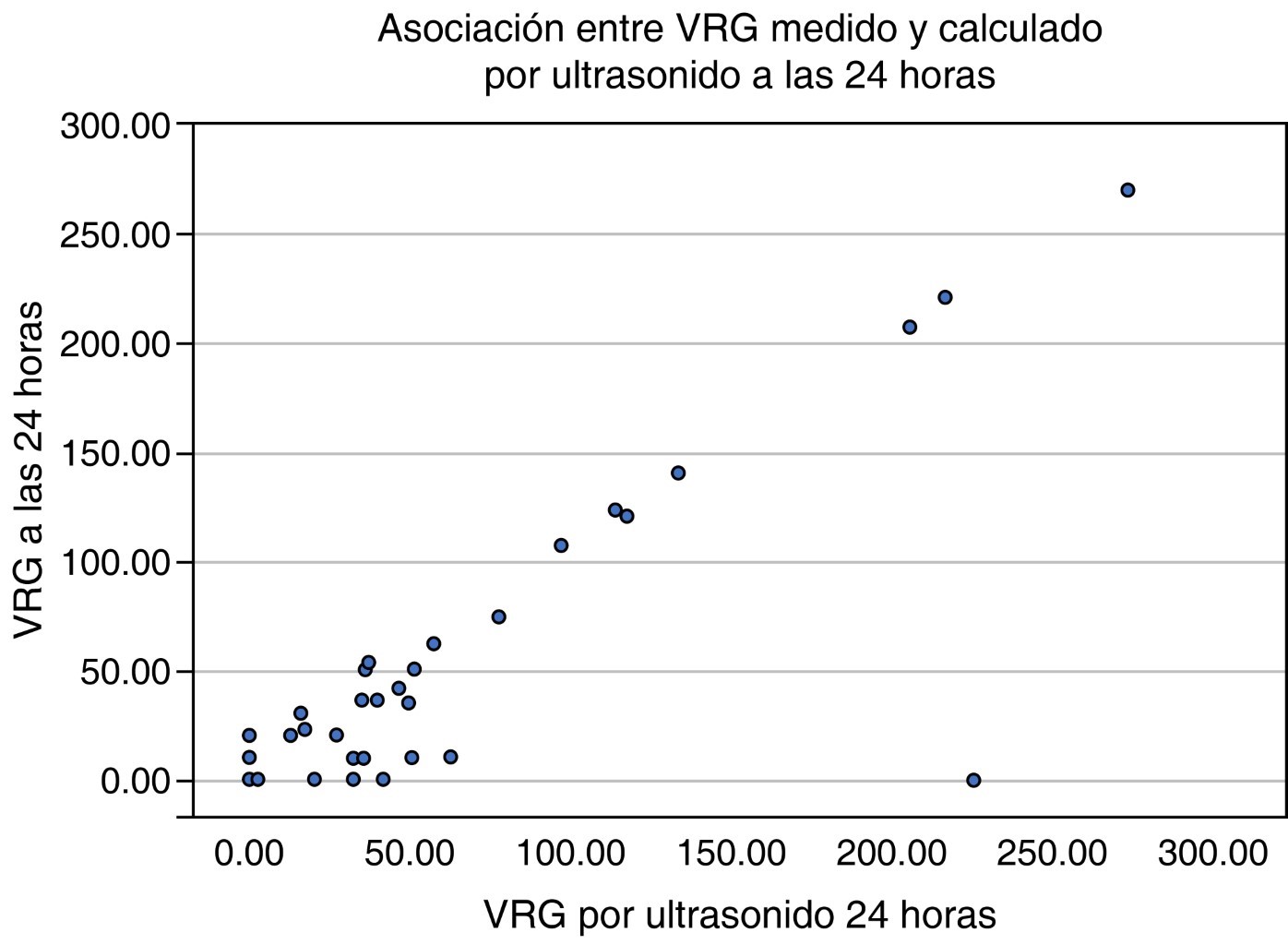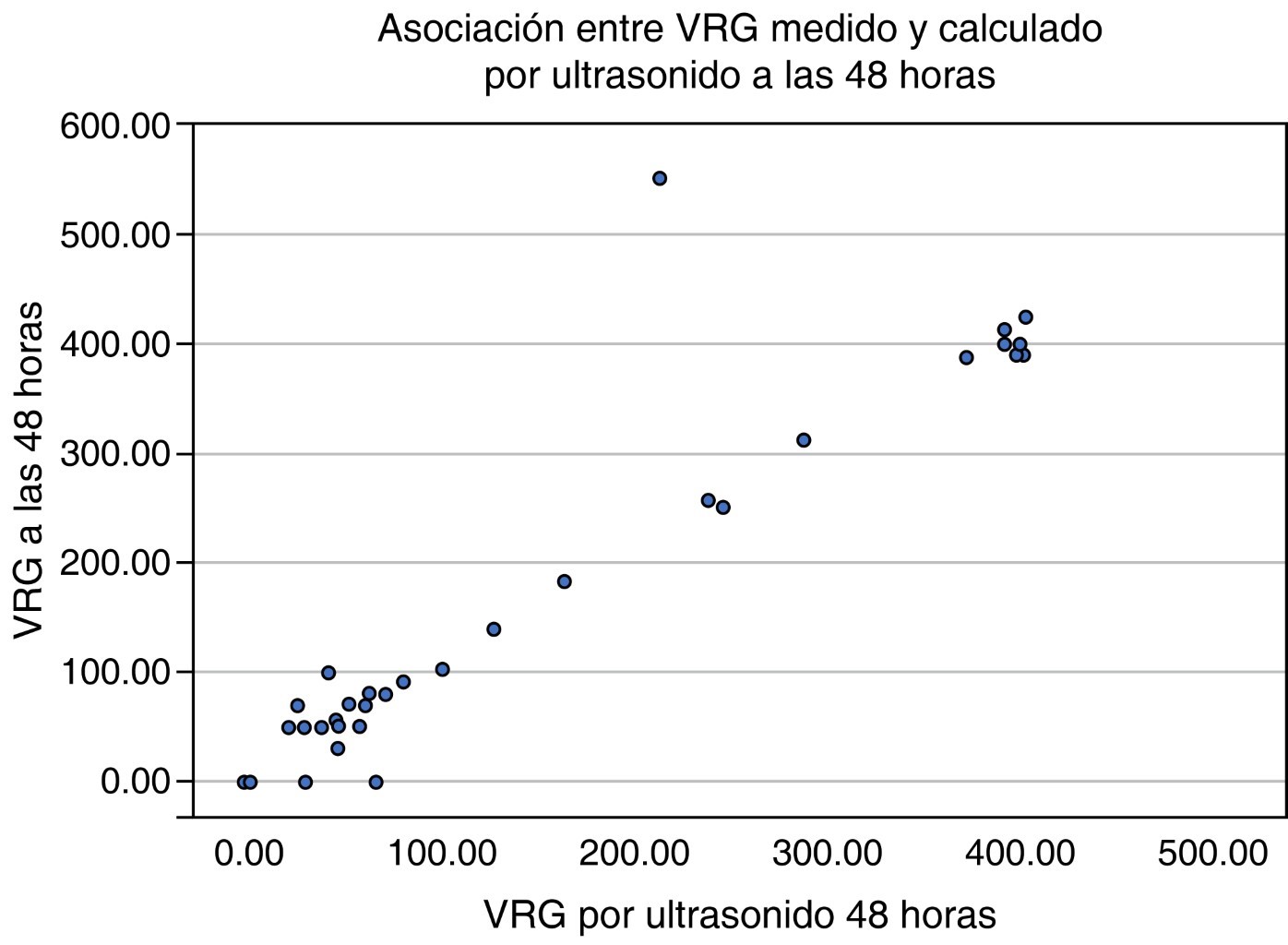 Se obtuvo correlación de Pearson del VRG medido con VRG calculado por ultrasonido al ingreso de 0.265 con valor de p = 0.137. A las 24 horas la correlación de Pearson fue de r = 0.818 con p ≤ 0.001. A las 48 horas se encontró una correlación de Pearson de r = 0.931 con p ≤ 0.001 (Figuras 3 y 4).