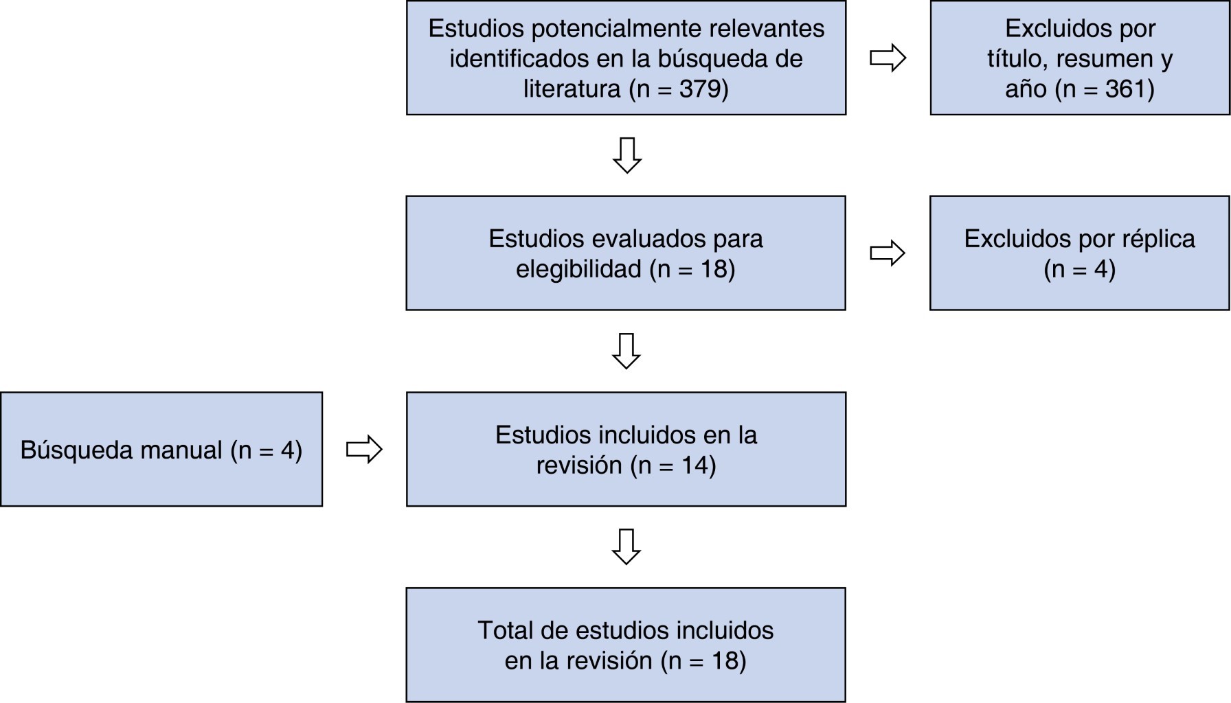 Mediante los métodos de búsqueda se identificaron 379 estudios. Una vez preseleccionados, se evaluó la congruencia con los criterios de inclusión y exclusión; para posteriormente, descartar 365 estudios. Se sumaron a éstos, cuatro estudios por búsqueda bibliográfica manual. En total, 18 estudios hicieron parte de esta revisión (Figura 1).