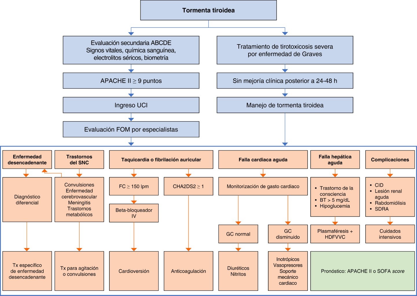 Los pacientes con tormenta tiroidea deben mantenerse bajo monitoreo cardiorrespiratorio constante para vigilancia de frecuencia cardiaca, frecuencia respiratoria, tensión arterial, saturación arterial parcial de oxígeno y temperatura, con elevación de cabecera entre 30 y 45°, vigilar uresis y balance de fluidos. Respecto al control térmico se debe evitar la administración de ácido acetilsalicílico, ya que éste al unirse a proteínas transportadoras incrementa la fracción libre de hormonas tiroideas. La hipertermia se puede controlar con antipiréticos y enfriamiento periférico o central. Se debe evaluar constantemente la función neurológica, cardiovascular, respiratoria, digestiva, hepática, hematoinfecciosa y endócrina, ya que se ha demostrado que el eje hipotálamo-pituitario-suprarrenal se encuentra alterado, a pesar del aumento de la producción de cortisol por la glándula suprarrenal, hay una respuesta subnormal a la hormona adrenocorticotrópica (ACTH), así como disminución en la reserva suprarrenal.33 En casos en los que se requiere anticoagulación (ej. fibrilación auricular) debe tomarse en cuenta que los pacientes con hipertiroidismo tienen una sensibilidad especial a la Warfarina y deben vigilarse estrechamente en este aspecto.