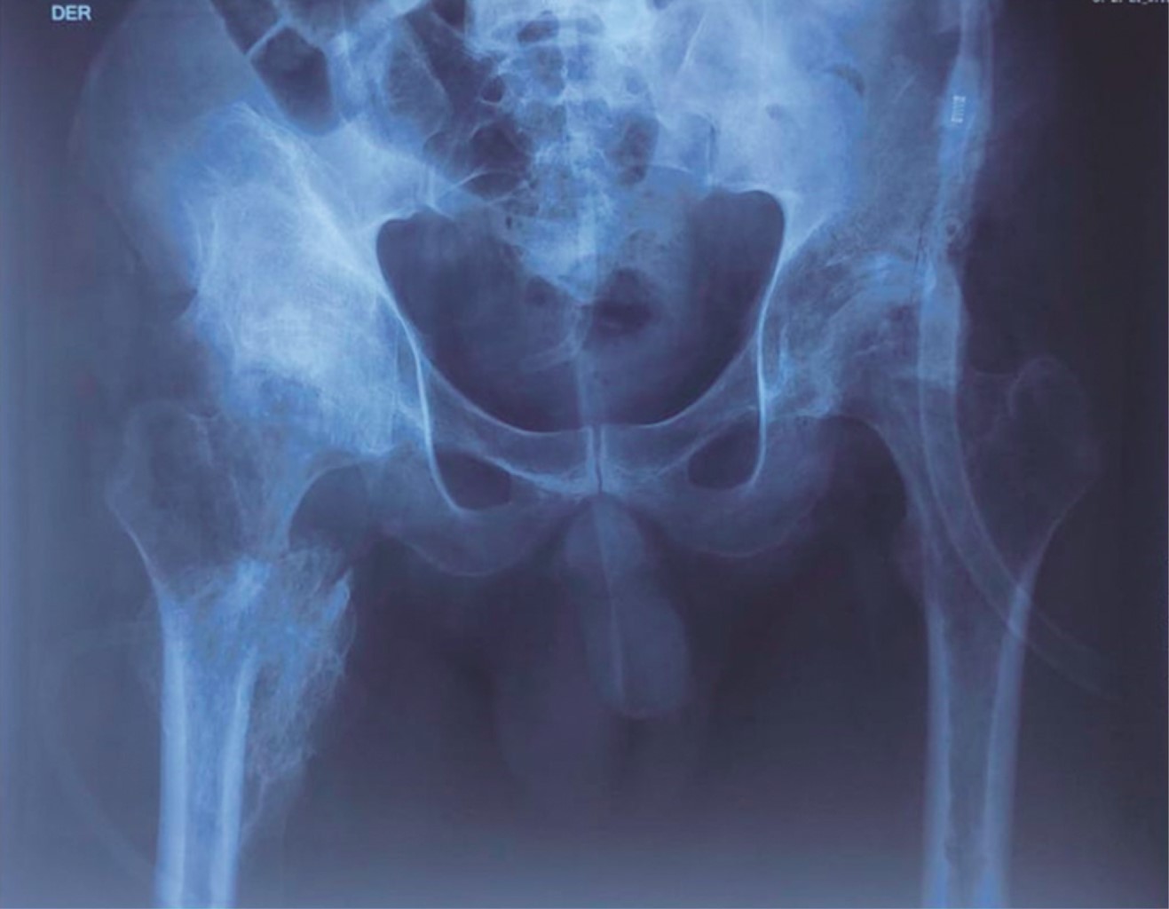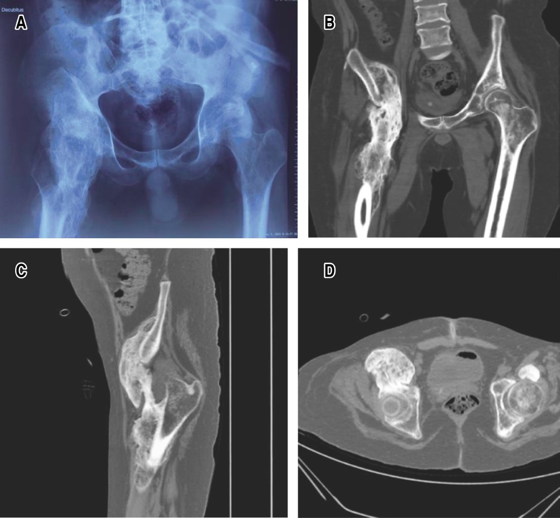Se trata de un hombre de 23 años quien fue referido de otro hospital por motivo de una tumoración ósea en cadera derecha en estudio. Acudió a la consulta externa de nuestro hospital; el motivo de consulta fue la incapacidad para la movilización pasiva de la cadera derecha. Entre sus antecedentes se encuentra una fractura de C6 con lesión medular secundarias a un accidente vial dos años antes de la consulta; el paciente requirió manejo quirúrgico por el Servicio de Neurocirugía de nuestra unidad; actualmente cursa con una lesión medular completa establecida con último nivel neurológico en C7. El paciente es dependiente de sus cuidadores para las actividades básicas de la vida diaria. A la exploración física encontramos paciente postrado en decúbito supino, con función sensitiva y motora abolidas de C8 hacia distal; a nivel de cadera derecha se encontró una tumoración palpable e indurada de aproximadamente 10 cm, la cual no era móvil ni fluctuante, sin datos clínicos de inflamación local. La cadera se encontraba anquilosada con una flexión de 10°, con llenado capilar inmediato.