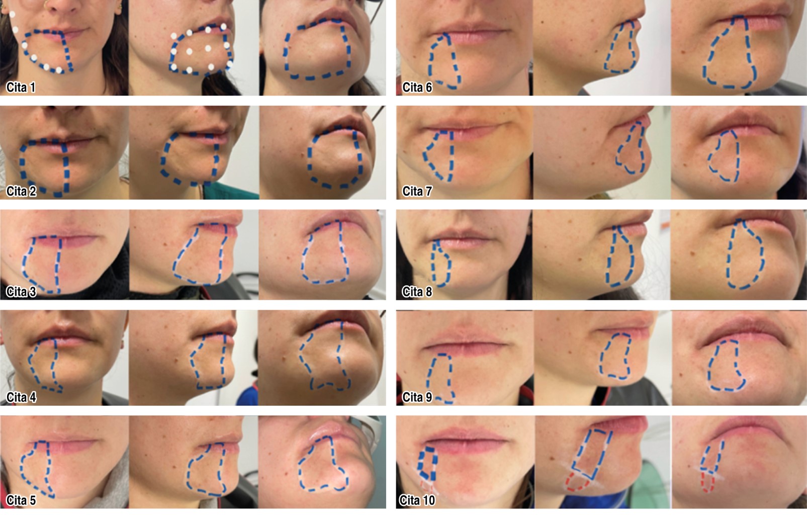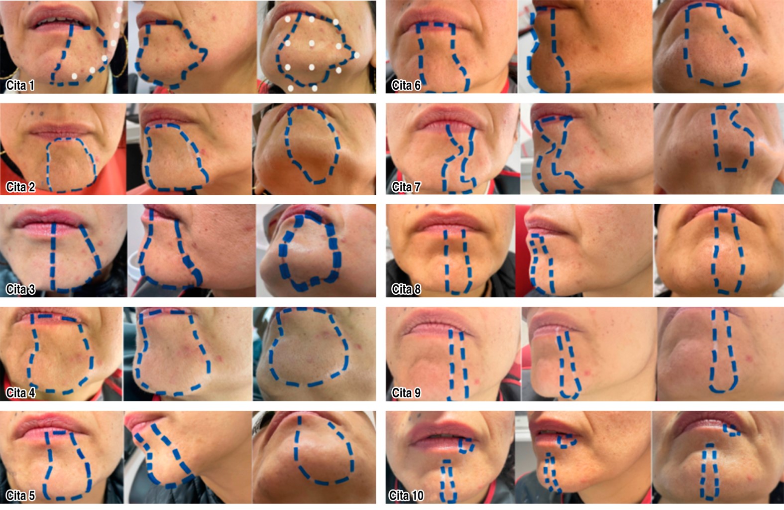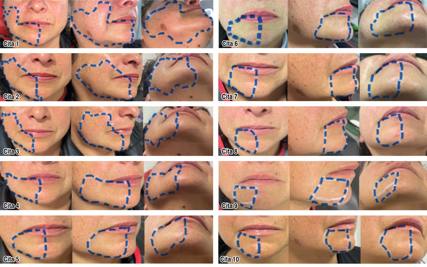El protocolo terapéutico implementado fue el descrito previamente, la energía utilizada en cada sesión varió de la siguiente manera: 1J por punto en las dos primeras sesiones, 2J por punto en la tercera y cuarta sesión, 3J por punto en la quinta y sexta sesión, y 4J por punto en la séptima y octava sesión. Sin embargo, ante la aparición de corrientazos y mayor sensibilidad a esta energía, se ajustó la dosis a 3J y 2J en la novena y décima sesión. Se realizaron pruebas de valoración y delimitación del área afectada en cada sesión (Figura 3). Inicialmente, mostró un valor de 0 según EVA, mejorando a un rango entre 6 y 7 al finalizar la décima sesión. La paciente refirió una mejora constante durante el tratamiento, también reportó sensaciones como hormigueo, corrientazos y prurito, especialmente al alcanzar la máxima energía emitida durante el tratamiento. Al finalizar, persistía una disestesia localizada y mayor sensibilidad al frío según las pruebas térmicas. A pesar de esto, la paciente está satisfecha con la mejoría, ya que desapareció el tic inicialmente reportado.