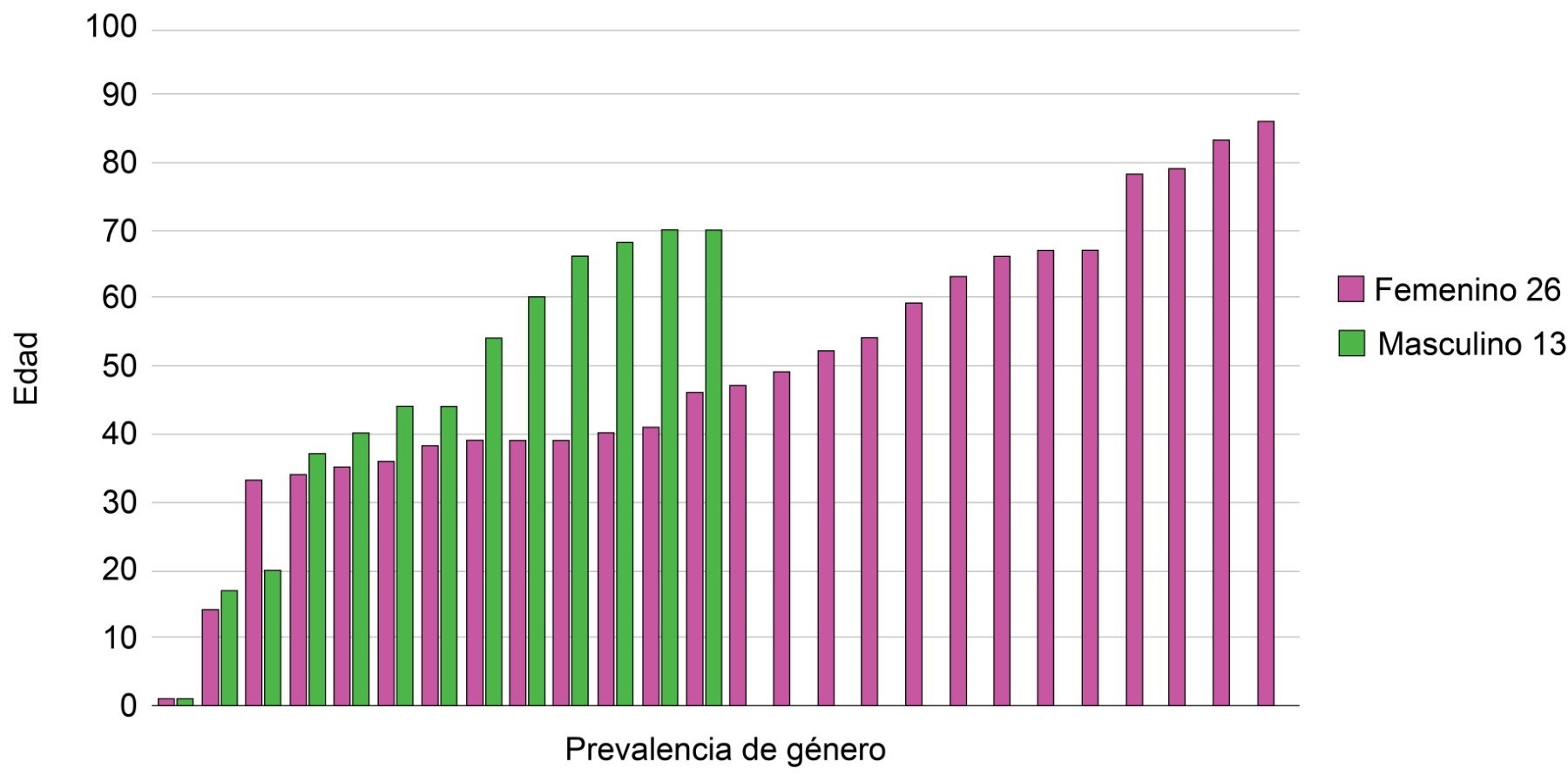 En la Figura 1 encontramos la distribución por sexo y edad, 26 correspondieron a pacientes femeninos (66.6%) y 13 correspondieron a pacientes masculinos, la edad varió de menos de un año hasta 88 años, el promedio de edad para las mujeres fue de 46 años, el promedio de edad para los hombres fue 49 años.