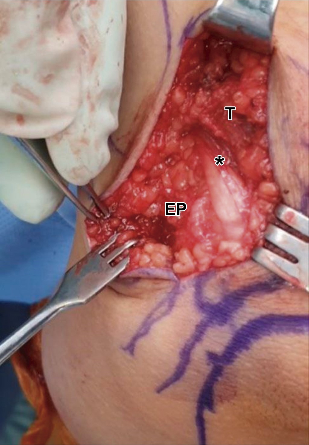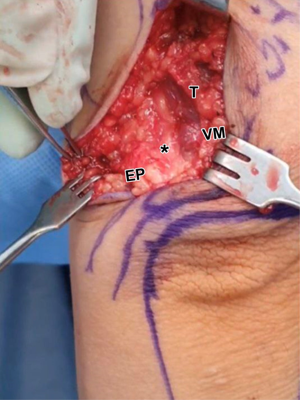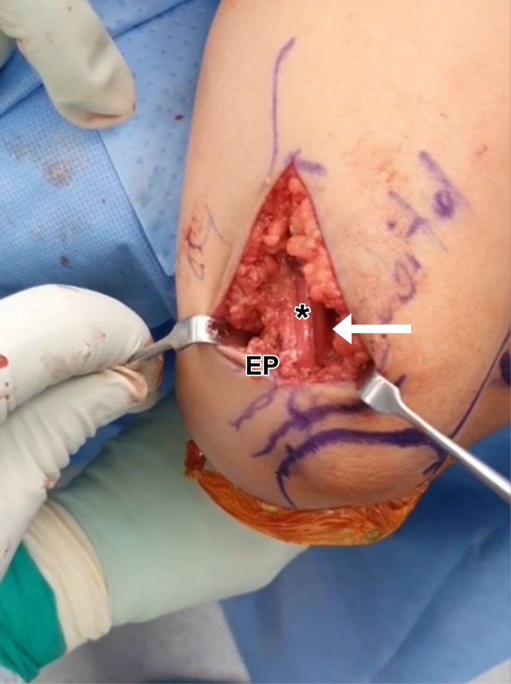 Se propone tratamiento quirúrgico con técnica de Spinner RJ modificada, que consiste en: a) transposición del vientre medial del tríceps a región central del tendón del tríceps (Figuras 1 y 2), b) neurólisis externa y descompresión del nervio cubital y c) estabilización a nivel del túnel cubital con tejido de la fascia de los epitrocleares, en lugar del colgajo fasciograso de la técnica original (Figura 3). En el seguimiento la paciente no presenta dolor o datos de subluxación o irritación del nervio cubital, se refiere satisfecha e inicia el retorno a la actividad física a los tres meses.