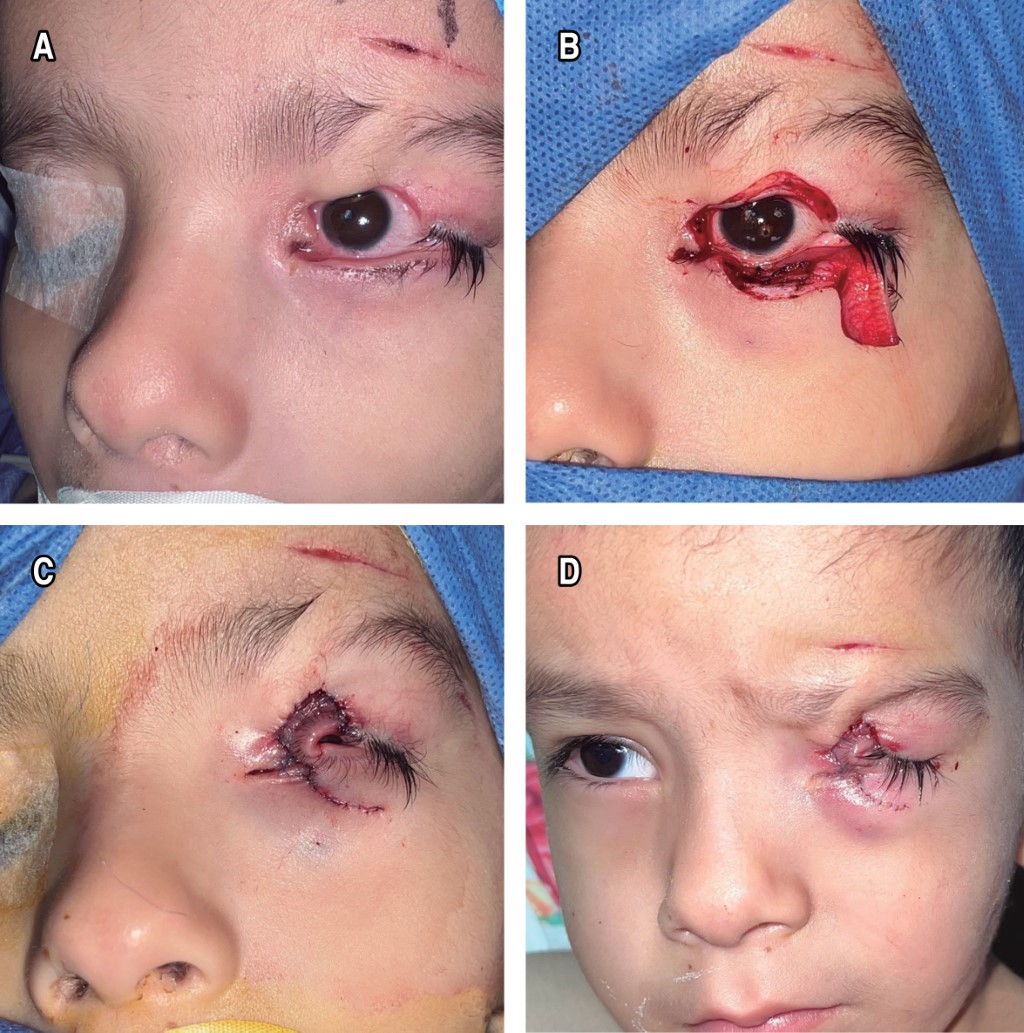 Se confirmó el diagnóstico clínico de coloboma simple y se planeó una cirugía en dos tiempos, iniciando con un colgajo rotacional de párpado inferior con posterior liberación y colocación de injerto cutáneo.