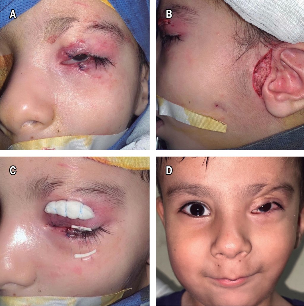 En el segundo tiempo quirúrgico, a cuatro semanas de diferencia, se realizó la liberación del colgajo de la porción más proximal del párpado inferior (Figura 2) para lograr la mayor porción de tejido al párpado superior. Para completar la lamela anterior del párpado superior y liberar tensiones, se decidió colocar un injerto de espesor total de región preauricular, así como sutura de Frost (Figura 2).