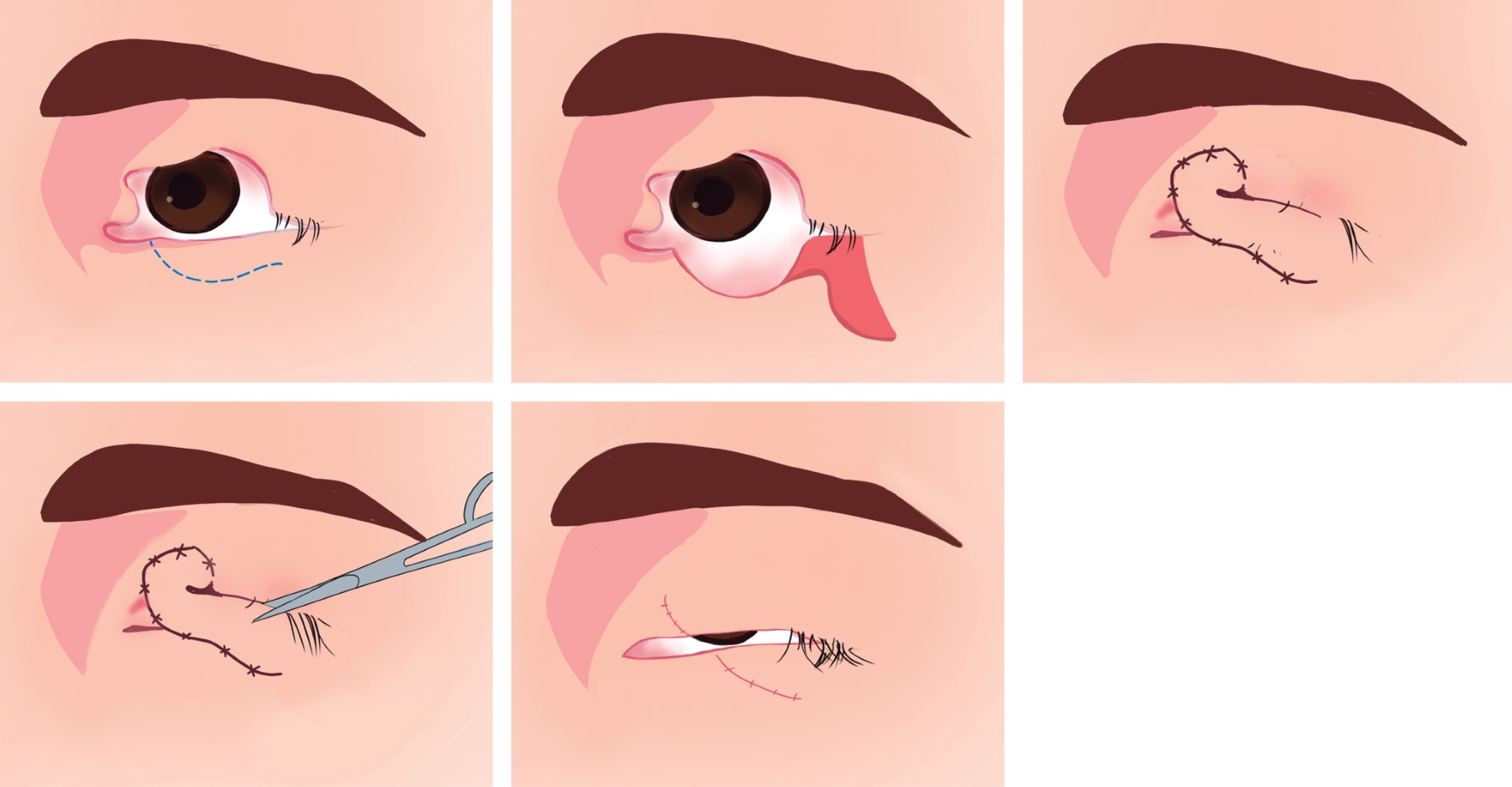 Se realizó la primera cirugía iniciando con disección del párpado inferior, dejando de forma permeable su porción lateral (Figura 1). Asimismo, se creó un triángulo de Burow para el avance y así permitir la rotación del colgajo. Se colocaron suturas tipo colchonero marginales a nivel de la línea gris. Se procedió a suturar la porción tarsal y el músculo orbicular con puntos simples con Vicryl 6-0 y el resto de la lamela anterior se suturó con puntos simples con Prolene (Figura 1).