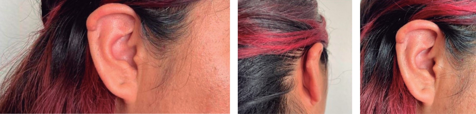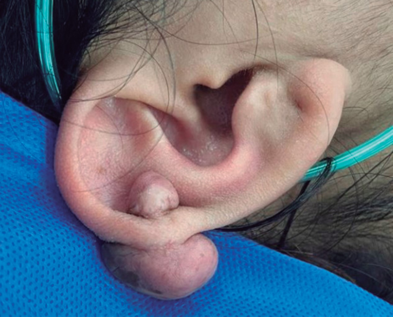 Mujer de 15 años, sin antecedentes de importancia, crónicos o toxicomanías, con la presencia en hélix derecho secundario a perforación infectada, cicatriz queloide con crecimiento progresivo, por lo que acudió a valoración al Hospital Pediátrico de Tacubaya para su manejo. Presentaba tumor en la región posterior del hélix derecho, de aproximadamente 3 cm, sésil, móvil, con tumor adicional en la parte interna del hélix de aproximadamente 1 cm, no dolorosas a la palpación (Figura 1).