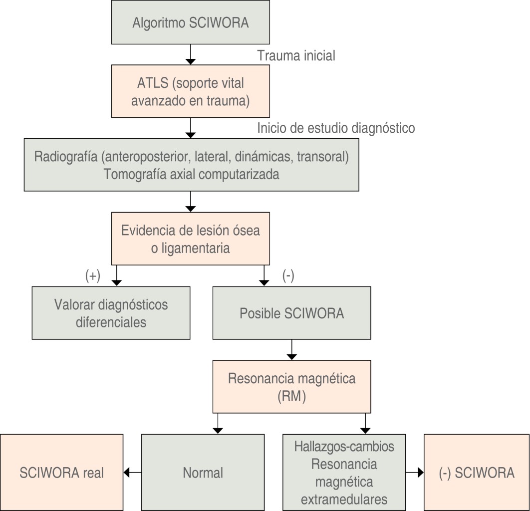 El algoritmo radiográfico se basará en el mecanismo del trauma, la edad, la presentación clínica, así como la estabilidad hemodinámica. Los pacientes con sospecha de lesión medular requieren de la realización de estudios de imagen iniciales como la radiografía y la tomografía axial computarizada. Dentro de la sospecha diagnóstica de SCIWORA será recomendable la realización de radiografías dinámicas de flexión y extensión o fluoroscopia para excluir el movimiento intersegmentario patológico compatible con lesión ligamentosa sin fractura.9,10