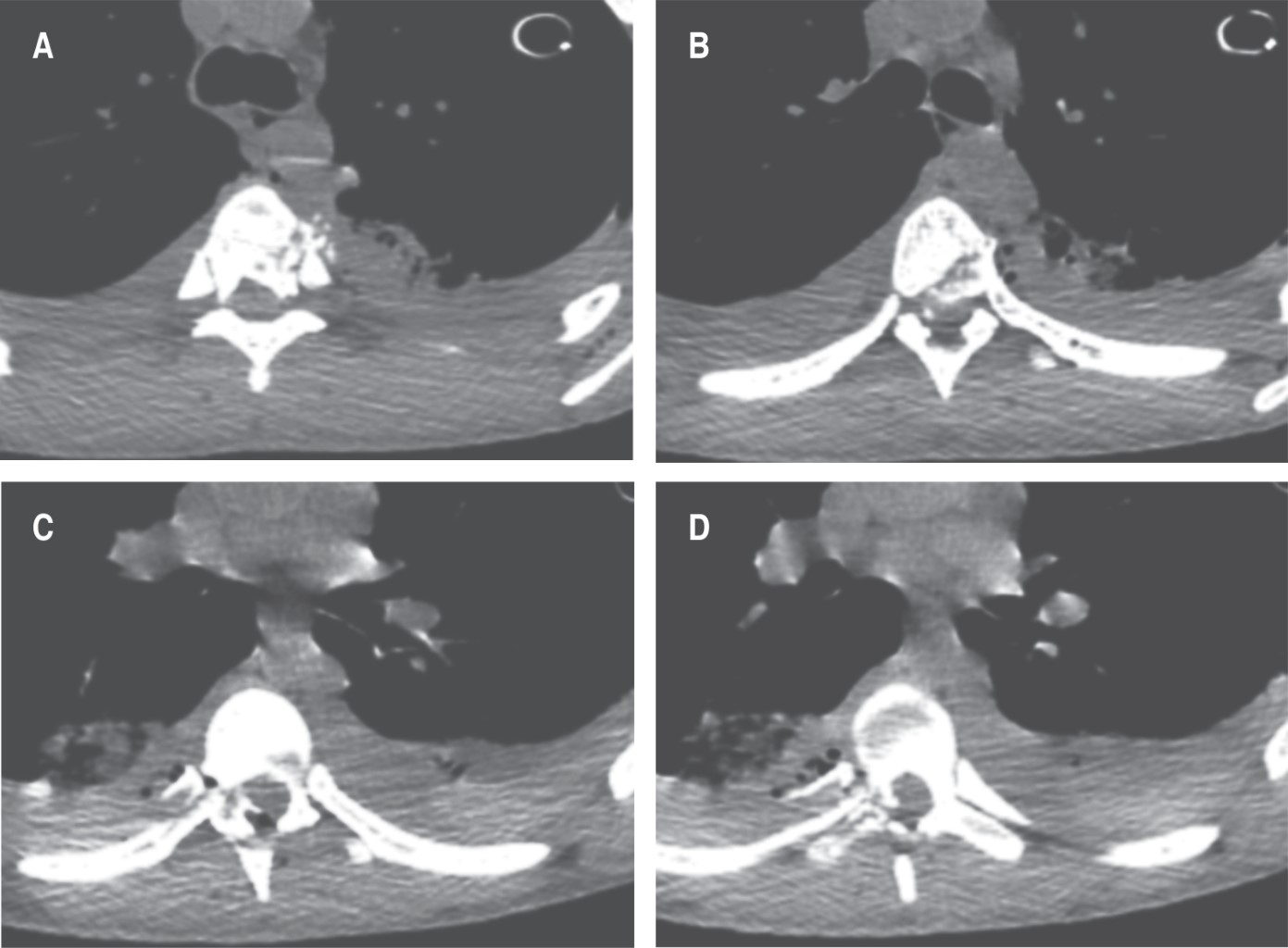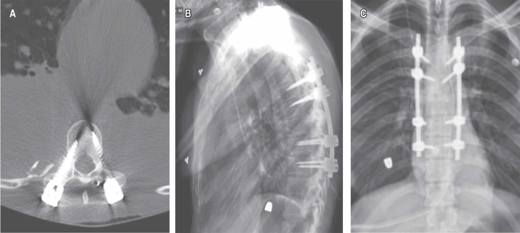 Se interconsulta al servicio de cirugía de columna, quien concluye en los siguientes diagnósticos a partir de exploración y hallazgos tomográficos (Figuras 1 y 2): fractura por estallido de T5 y T6 Gustillo-Anderson IIIA, fractura de los pedículos derechos de T6 y T7, traumatismo raquimedular secundario a proyectil por arma de fuego Frankel A, ASIA A y fractura de articulación costovertebrales de arcos costales 8 y 9; por lo que a los 11 días de estancia intrahospitalaria se procedió a instrumentación torácica posterior con hemilaminectomía para descompresión, estabilización y movilización, con pronóstico malo para la función. Durante la intervención se observa lesión del pedículo y lámina T5, por lo que no es posible instrumentar dicho nivel, optando por instrumentar dos niveles por encima y dos niveles por debajo. Se realizó colocación de tornillos transpediculares poliaxiales en T3, T4, T6 y T7 con colocación de 30 cc de injerto óseo en chips (Figura 3), asistido por fluoroscopia.