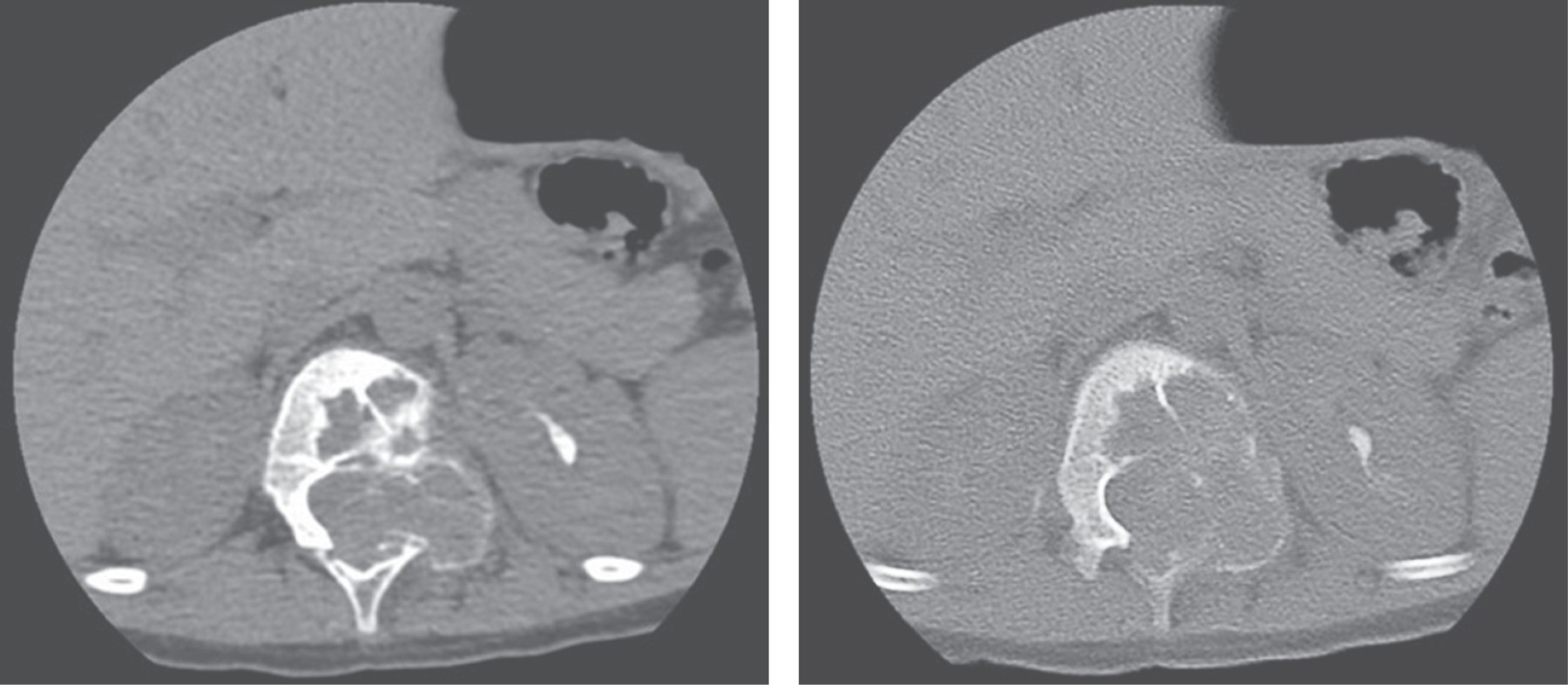 Durante el seguimiento a 12 meses presentó una recuperación de la sensibilidad en ambas extremidades inferiores y de la fuerza a 4+/5 bilateral, así como una normorreflexia. El diagnóstico prequirúrgico, basado en la clínica y los estudios radiológicos inicialmente fue de un osteosarcoma telangiectásico, no obstante, con el resultado histopatológico se hizo el diagnóstico definitivo de quiste óseo aneurismático.