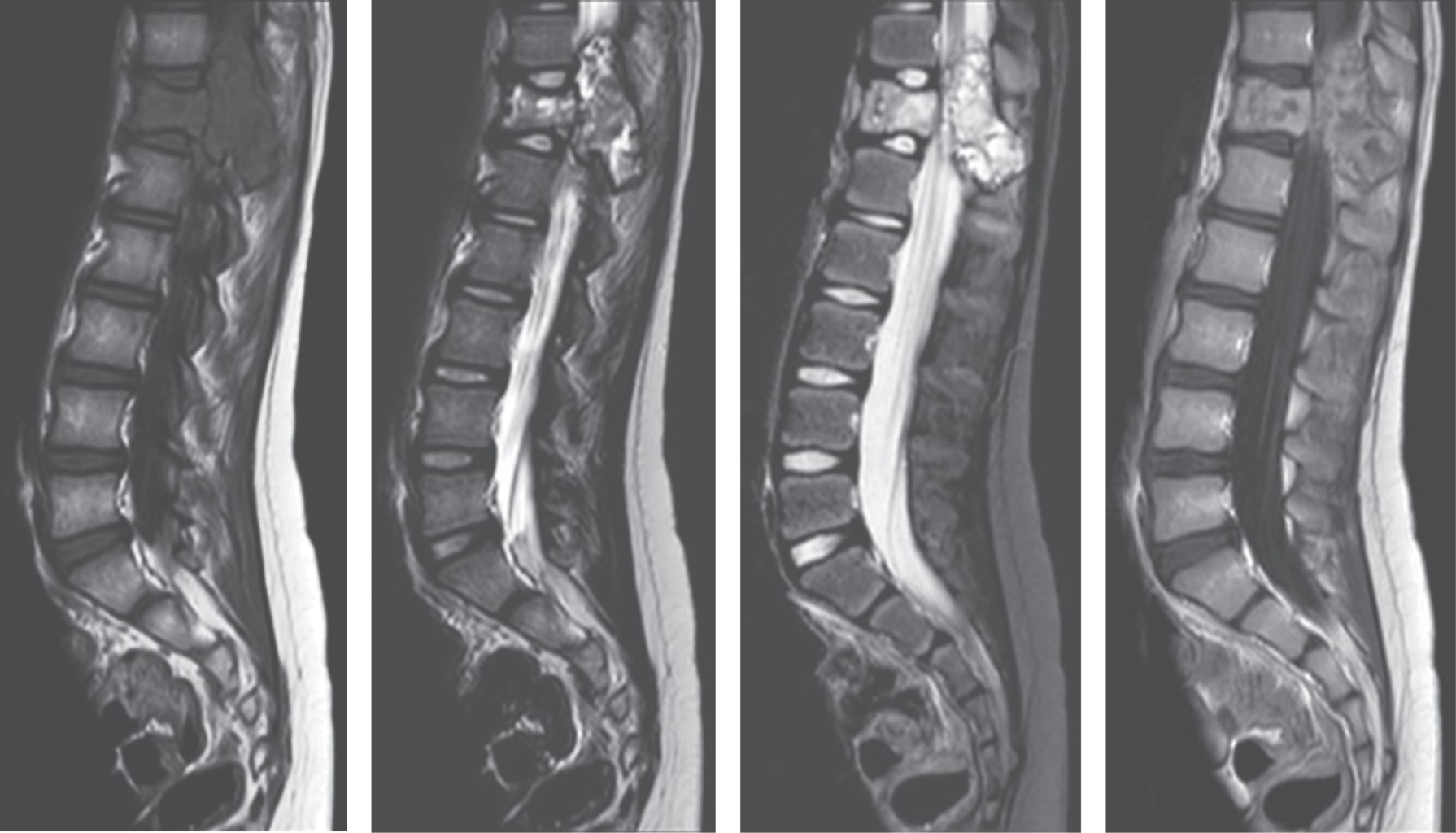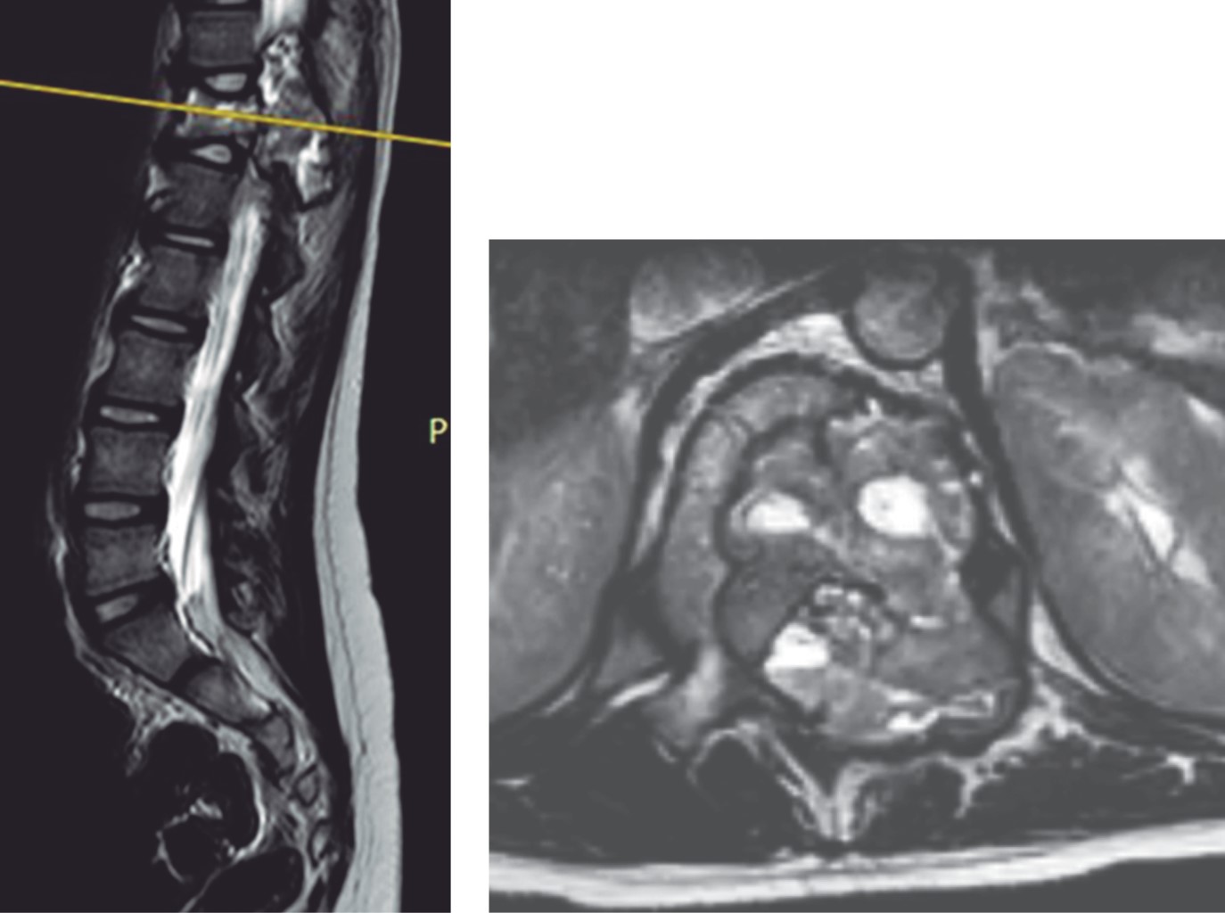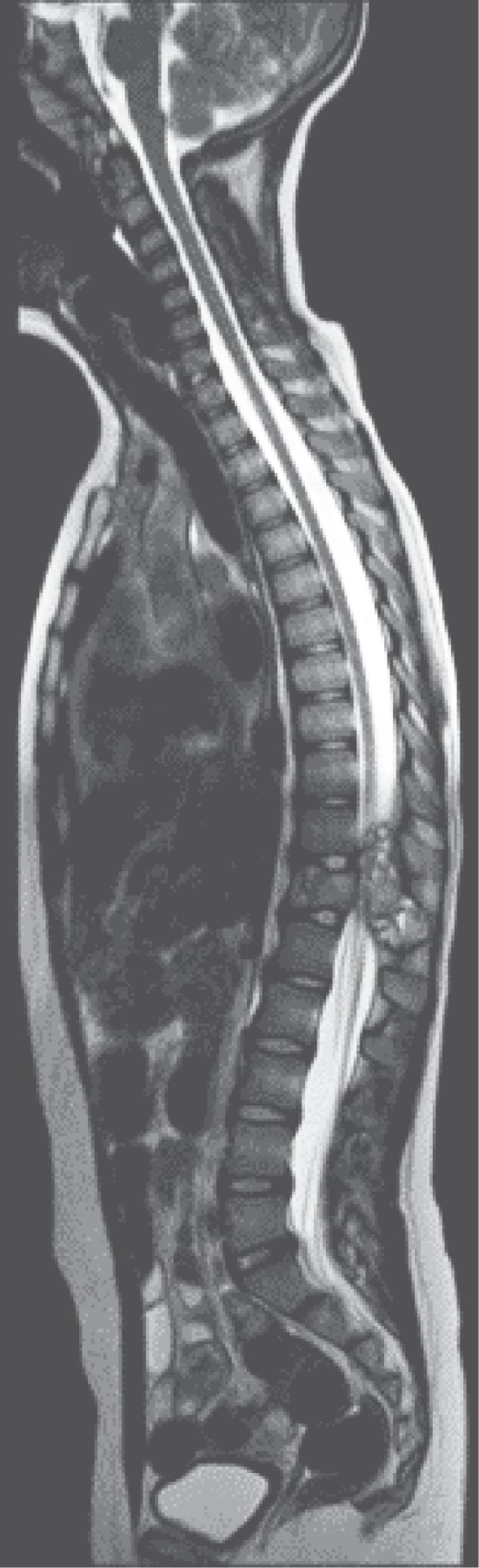 Paciente femenino de 13 años quien presenta dorsolumbalgia de predominio nocturno, de un mes de evolución, que condicionaba limitación a la marcha. A su ingreso se corrobora una paraparesia 3/5 en miotomos L3-S1 izquierdos y 4/5 en derechos, reflejos +++/+++ patelar y aquíleo bilateral, disminución en la sensibilidad termoalgésica desde L2 hacia distal de predominio izquierdo, propiocepción conservada.