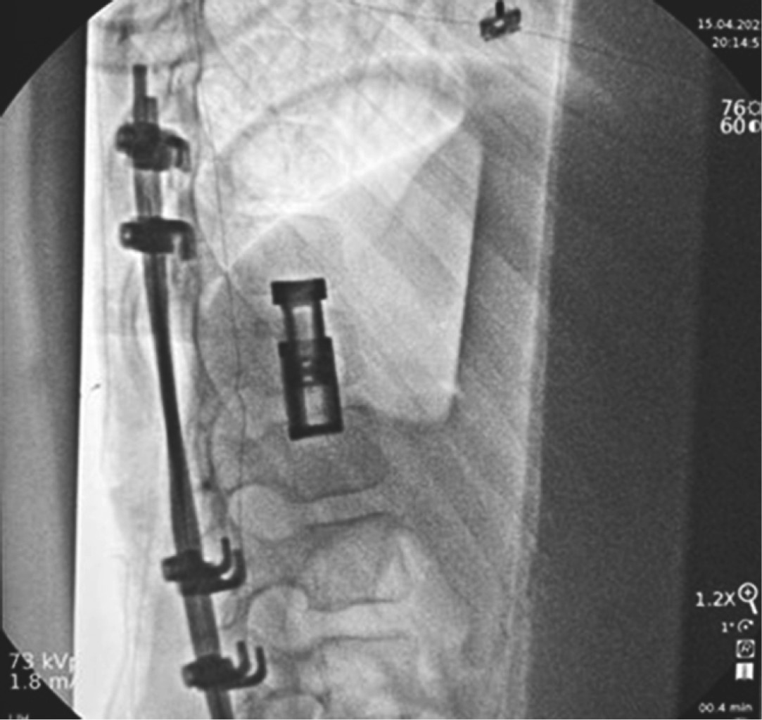 Es intervenida quirúrgicamente mediante una costotransversectomía izquierda, corpectomía T12 y resección de lesión. Para la instrumentación se movilizó la raíz izquierda T11 en sentido superolateral y la de T12 inferolateral aproximadamente 3 cm, observando el saco dural, creando de esta forma un corredor interneural. Se insertó la caja rellenada de matriz ósea de forma colapsada a través del corredor y una vez que pasa ambas raíces, es rotada para colocar la caja en alineación con el eje longitudinal de la columna. La porción telescópica de la caja es colocada caudalmente evitando el estiramiento de la raíz nerviosa inferior a medida que se expande. Posteriormente se realizó la fijación de T10-L2 con ganchos sublaminares. Como hallazgos transquirúrgicos se observaron cavidades llenas de sangre de aspecto antiguo, color café rojizo, múltiples tabiques en su interior que se extendía desde la lámina, pedículo y cuerpo vertebral con invasión al canal medular condicionando su compresión sin datos de afección a la duramadre.