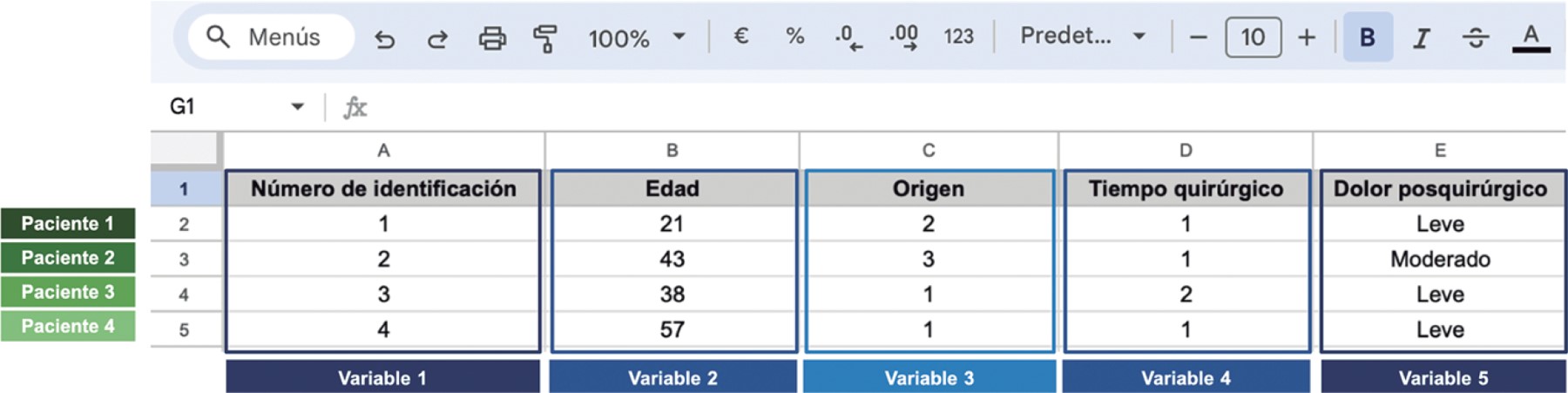Una herramienta sencilla y básica que funciona como base de datos es la hoja de cálculos frecuentemente utilizada para una preparación preliminar de los datos. La aplicación más reconocida para este trabajo es Microsoft Excel. En la hoja de cálculo, cada fila corresponde a un paciente y cada columna representa una variable. En ocasiones es conveniente codificar las variables cualitativas con la finalidad de facilitar su manejo, por ejemplo, asignar los valores numéricos dependiendo del origen del paciente cuyos datos se están registrando: 1 (consulta externa), 2 (urgencias), 3 (hospitalizado), entre otros. En el caso de las variables cuantitativas por lo general no requieren ser asignadas a códigos, a excepción de los casos donde las variables se organizan en rangos, por ejemplo, el tiempo quirúrgico: 1 (1 a 2 horas), 2 (3 a 4 horas), 3 (> 5 horas) y así sucesivamente.2,9 En la Figura 1 se describe un breve ejemplo de la estructura de una base de datos plasmada en una hoja de cálculo.