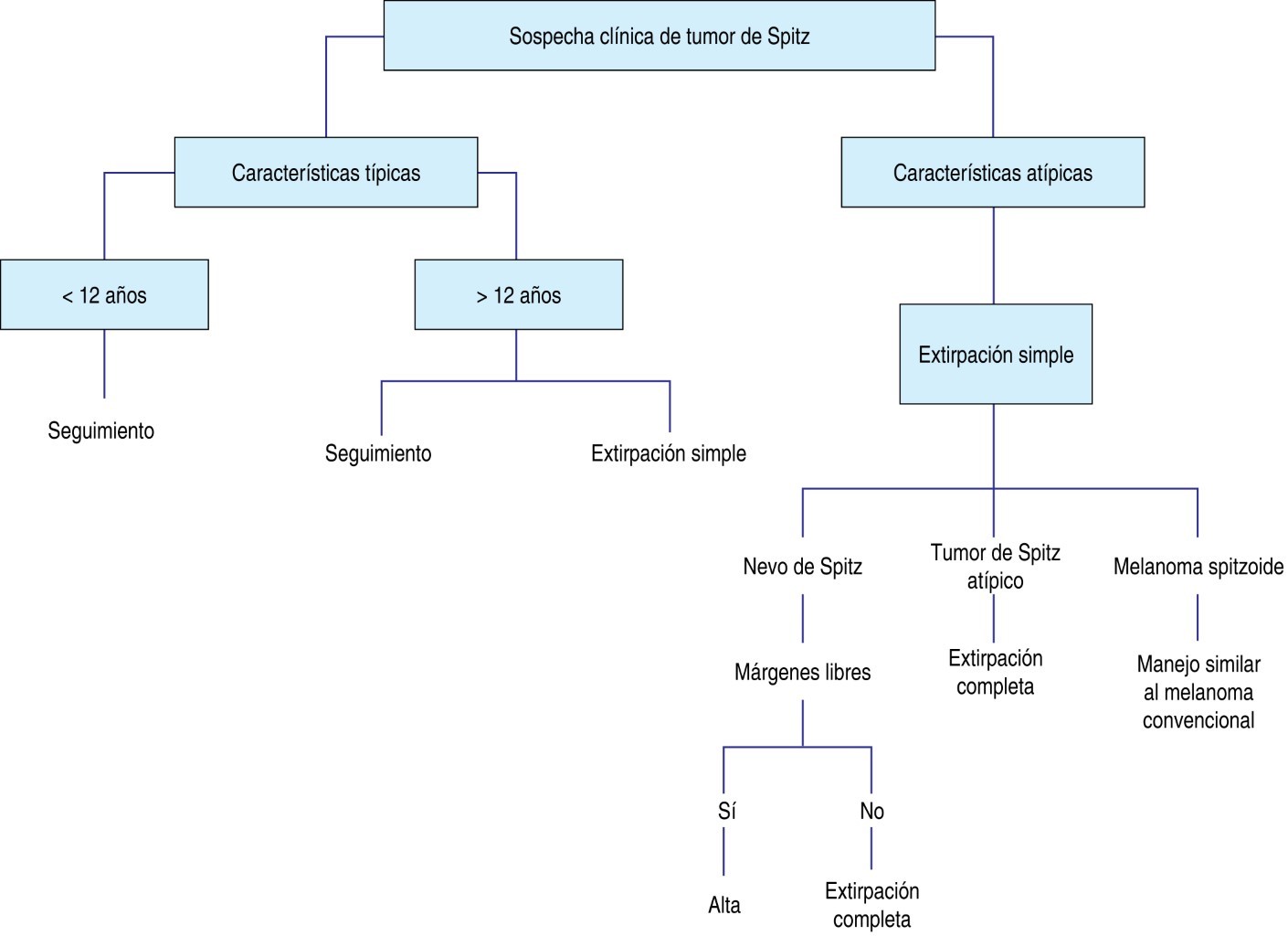 Tras la sospecha de un nevo de Spitz, se sugiere normar la conducta terapéutica de acuerdo con las características clínicas y la edad del paciente. En niños menores de 12 años, se puede optar por manejo conservador con vigilancia estrecha cada tres a seis meses por los primeros tres años, el cual debe prolongarse de forma anual si no se observan cambios de color, forma o tamaño, por la baja incidencia de melanoma en el grupo etario.