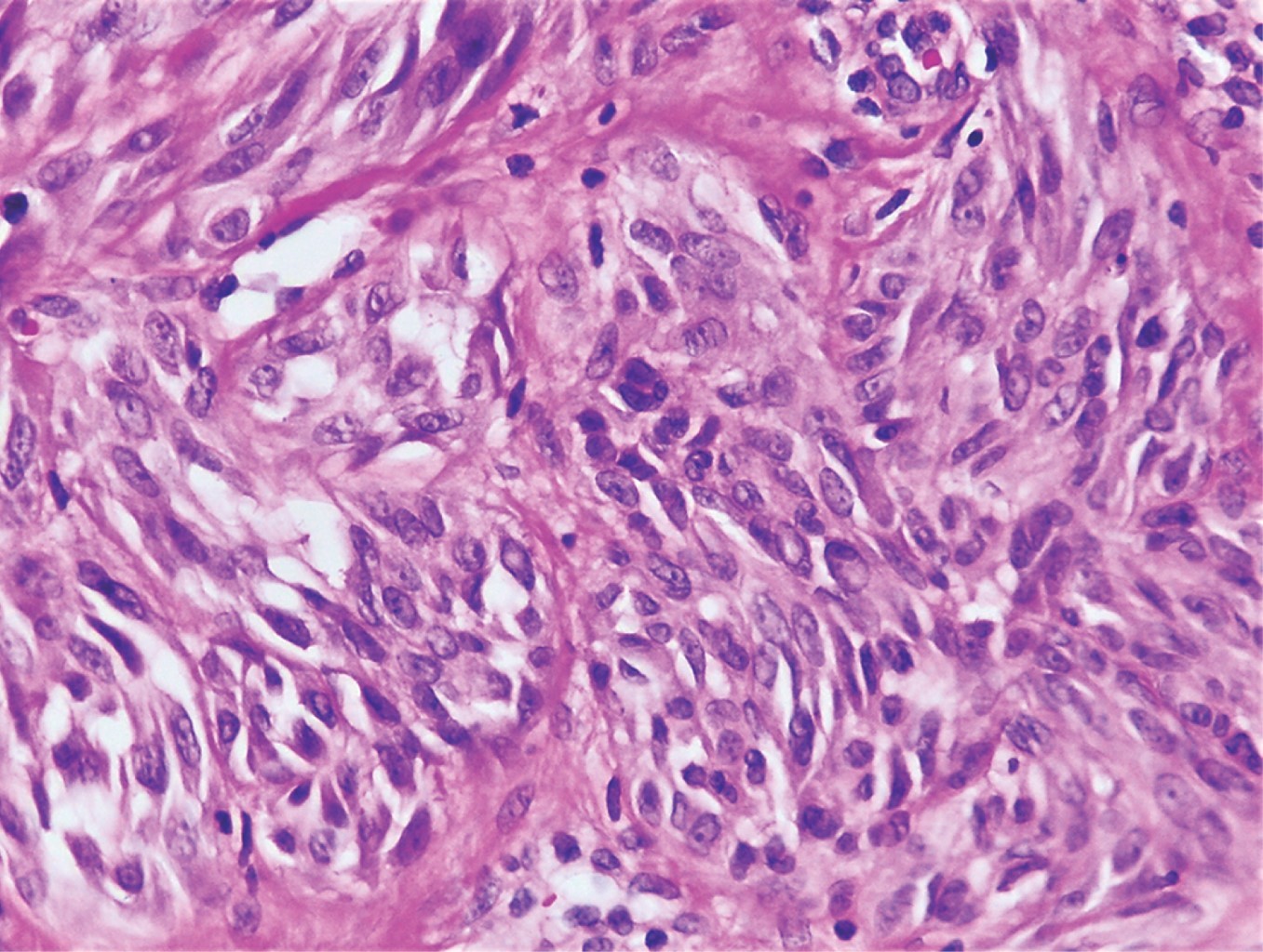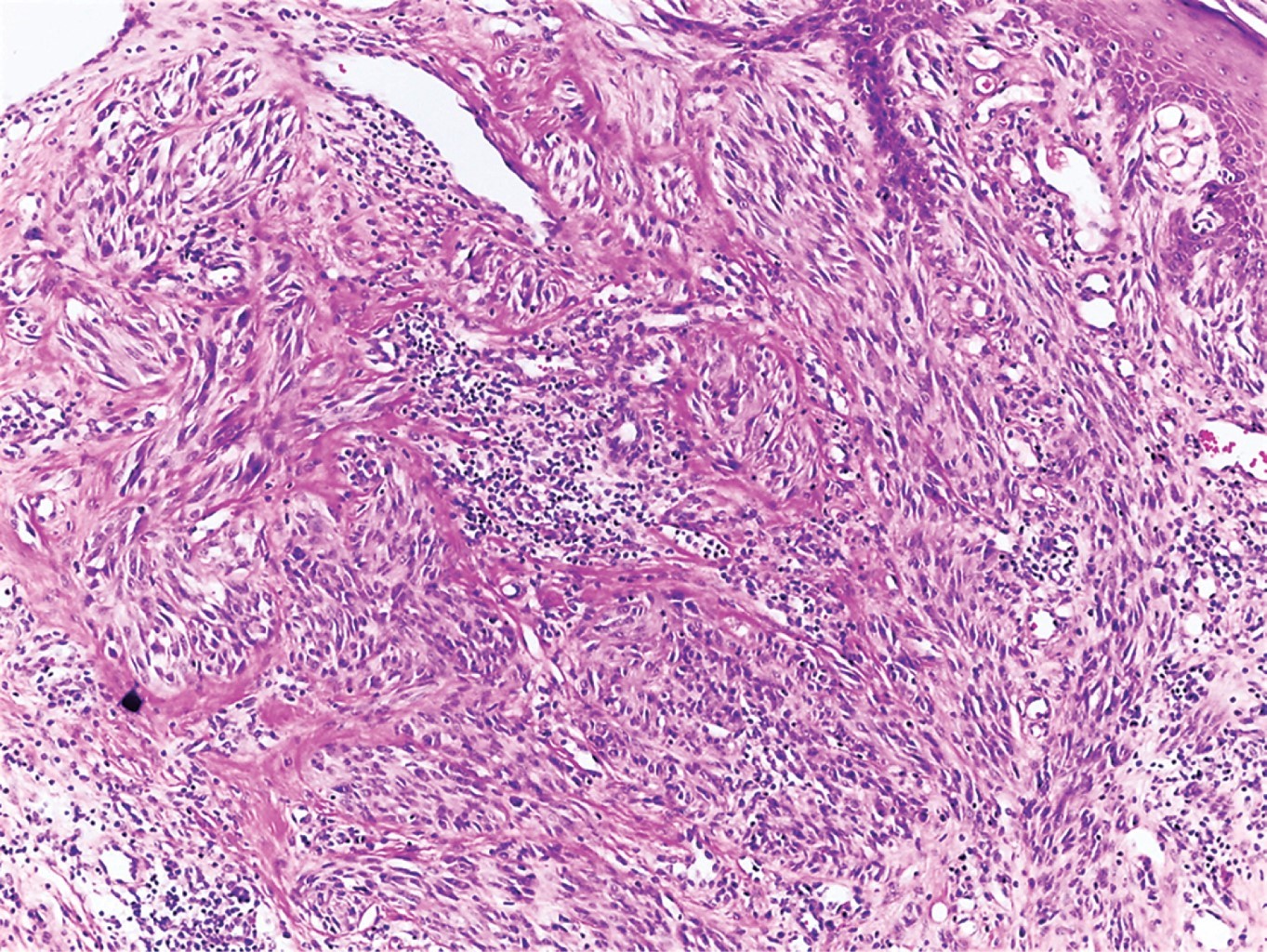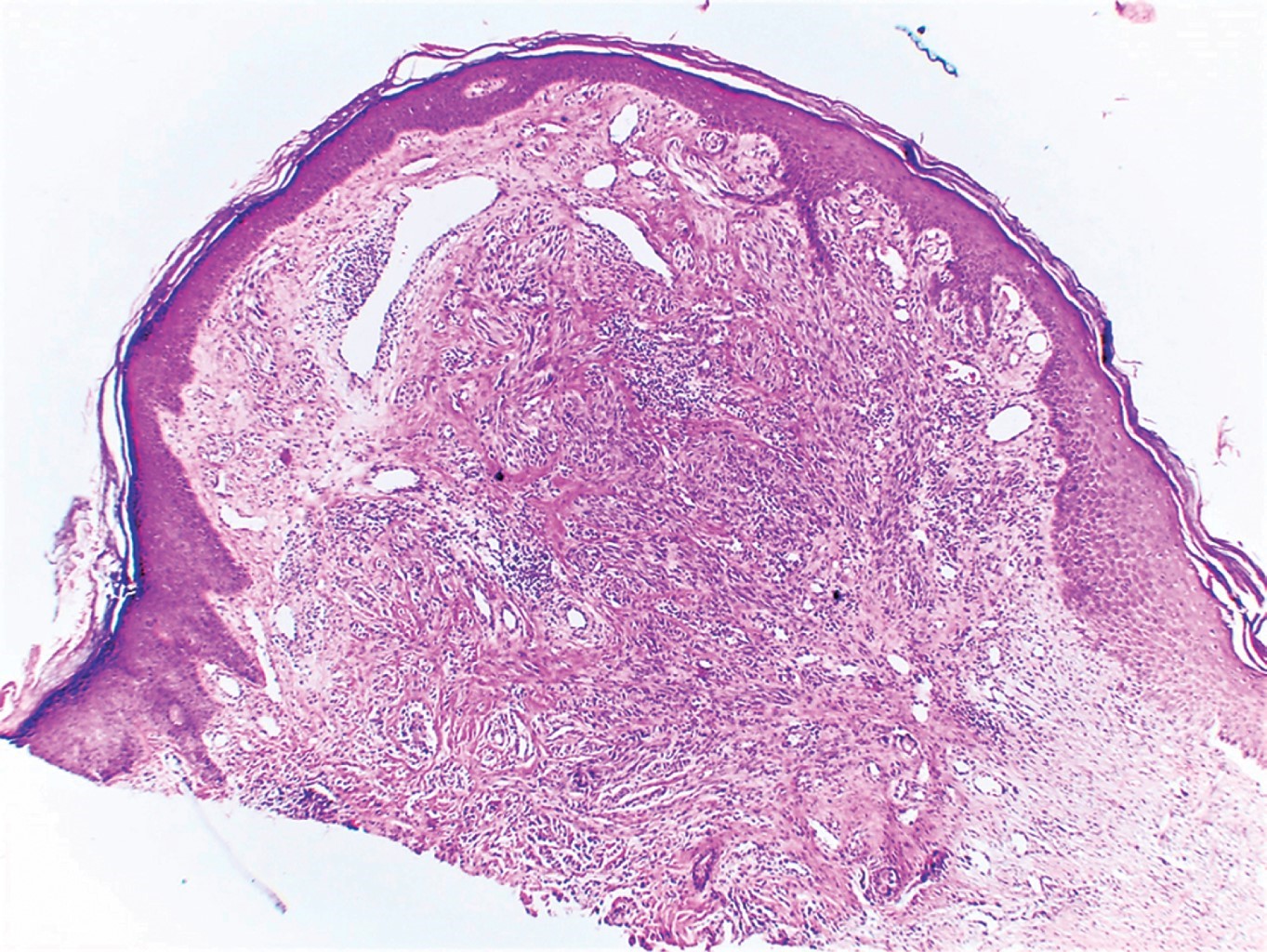 Con los datos anteriores se diagnostica granuloma piógeno, por lo que se efectúa rasurado de la lesión y se envía al Servicio de Dermatopatología, en donde se reporta nevo de Spitz con extirpación incompleta, con la siguiente descripción histopatológica: los cortes muestran neoformación exofítica cuya epidermis presenta hiperqueratosis, grandes tapones córneos y zonas con aplanamiento de los procesos interpapilares. En el espesor de la dermis se observan melanocitos de aspecto epitelioide y fusiformes que tienden a formar nidos y están inmersos en un estroma fibroso (Figuras 2, 3 y 4).