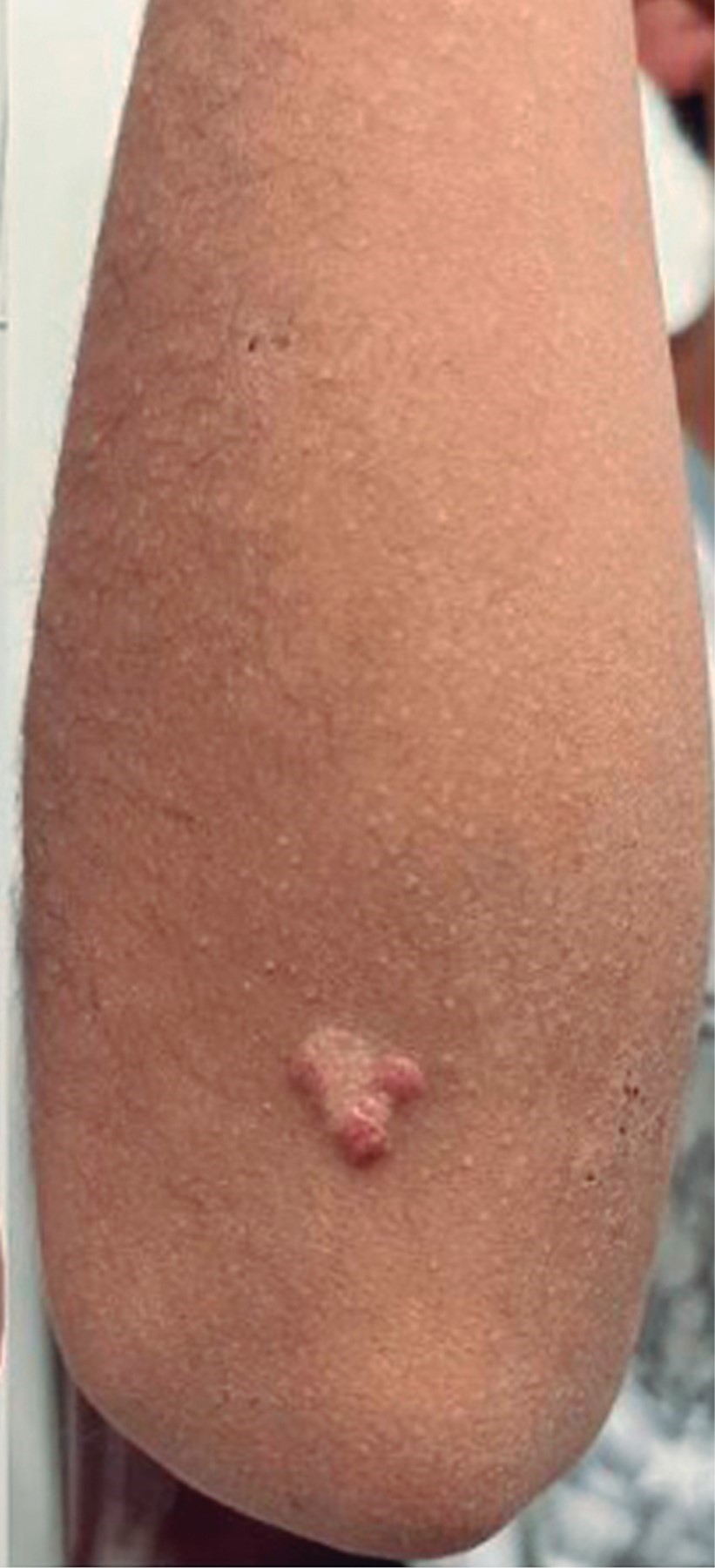 El caso corresponde a un paciente masculino de nueve años, originario y residente de la Ciudad de México, sin antecedentes médicos de importancia, quien acudió por dermatosis localizada a extremidad superior derecha, de la que afectaba tercio proximal de antebrazo, en forma unilateral. Dicha dermatosis estaba constituida por una neoformación lobulada, de base eritematosa y costra hemática en su superficie, de siete meses de evolución y a decir de la madre, de fácil sangrado tras ser traumatizado.