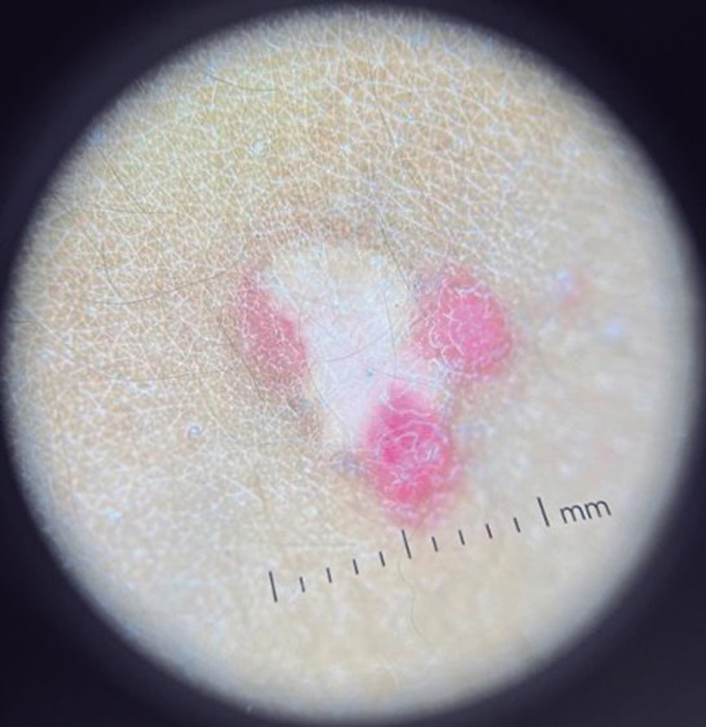 A la exploración presentaba una neoformación, multilobulada, del color de la piel en unas áreas, eritematosa en otras, sobre una cicatriz eutrófica, de bordes bien definidos, con dimensiones de 0.9 × 0.8 cm (Figura 5). La dermatoscopía demostró un patrón vascular puntiforme y color rosa homogéneo (Figura 6) motivo por el cual fue enviado al Servicio de Dermatooncología y Cirugía Dermatológica, en donde le realizaron extirpación de la neoformación con margen de 5 mm. Sin recidivas hasta el momento.
