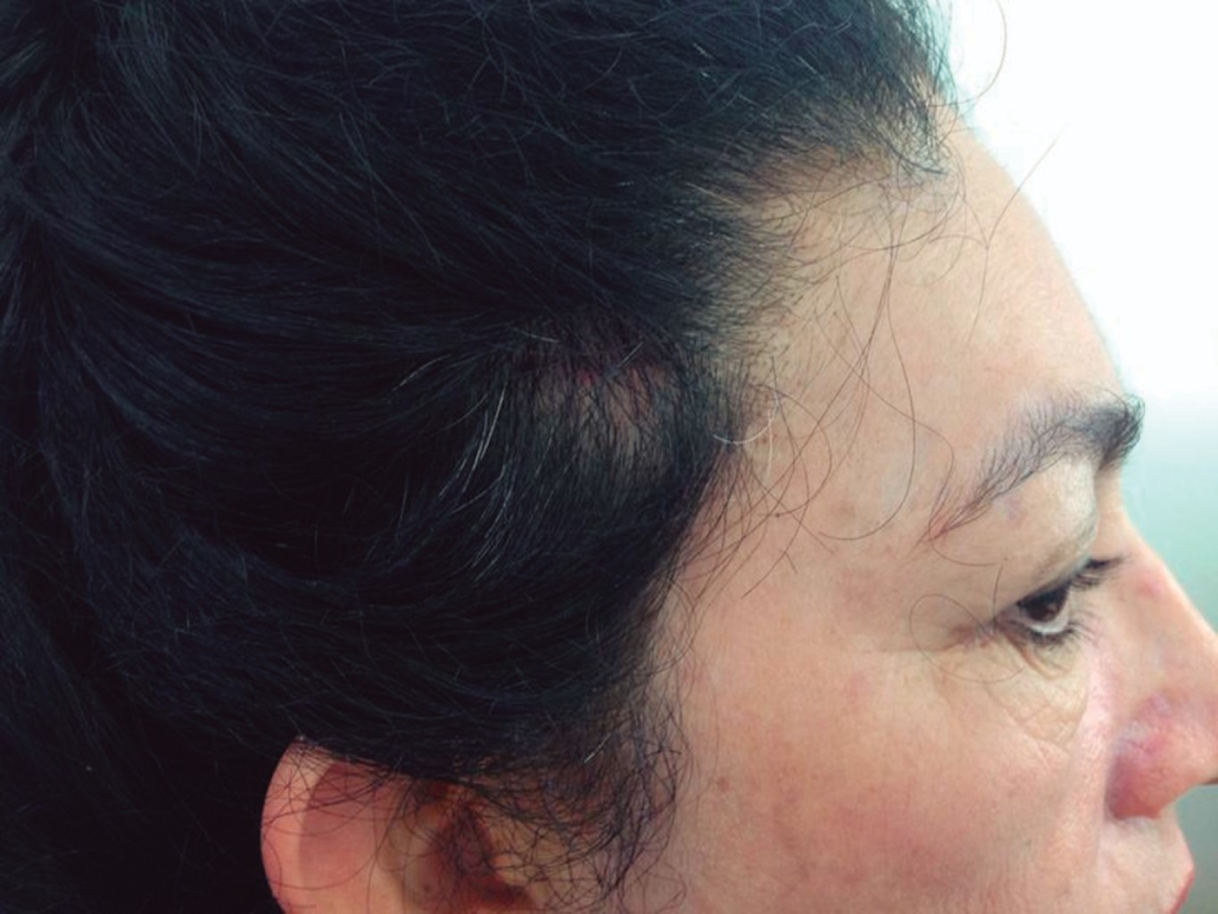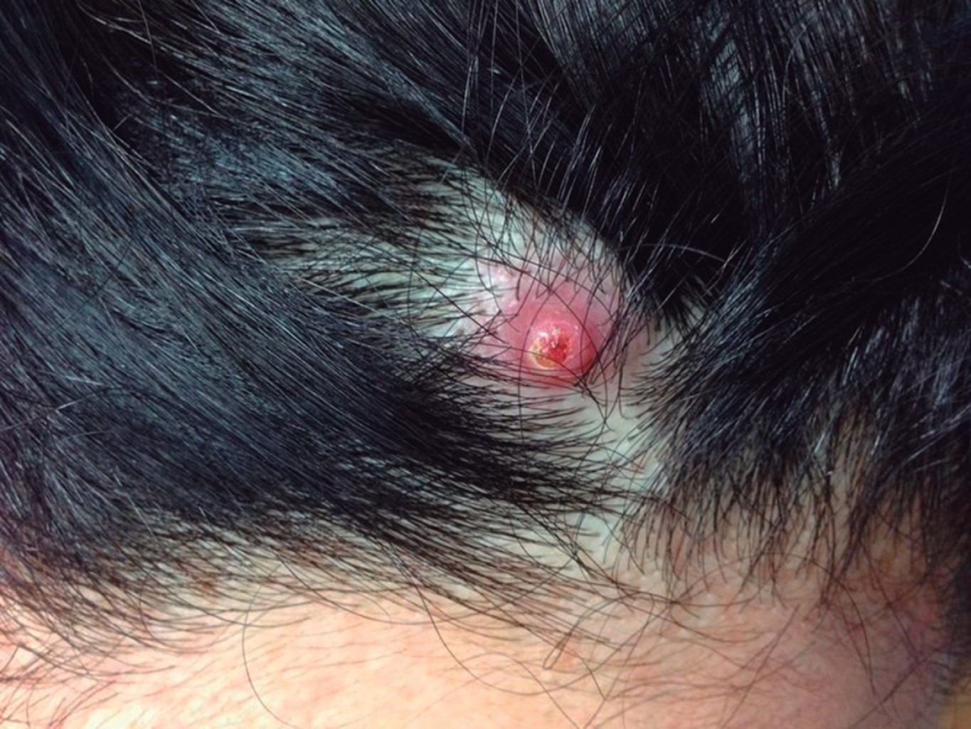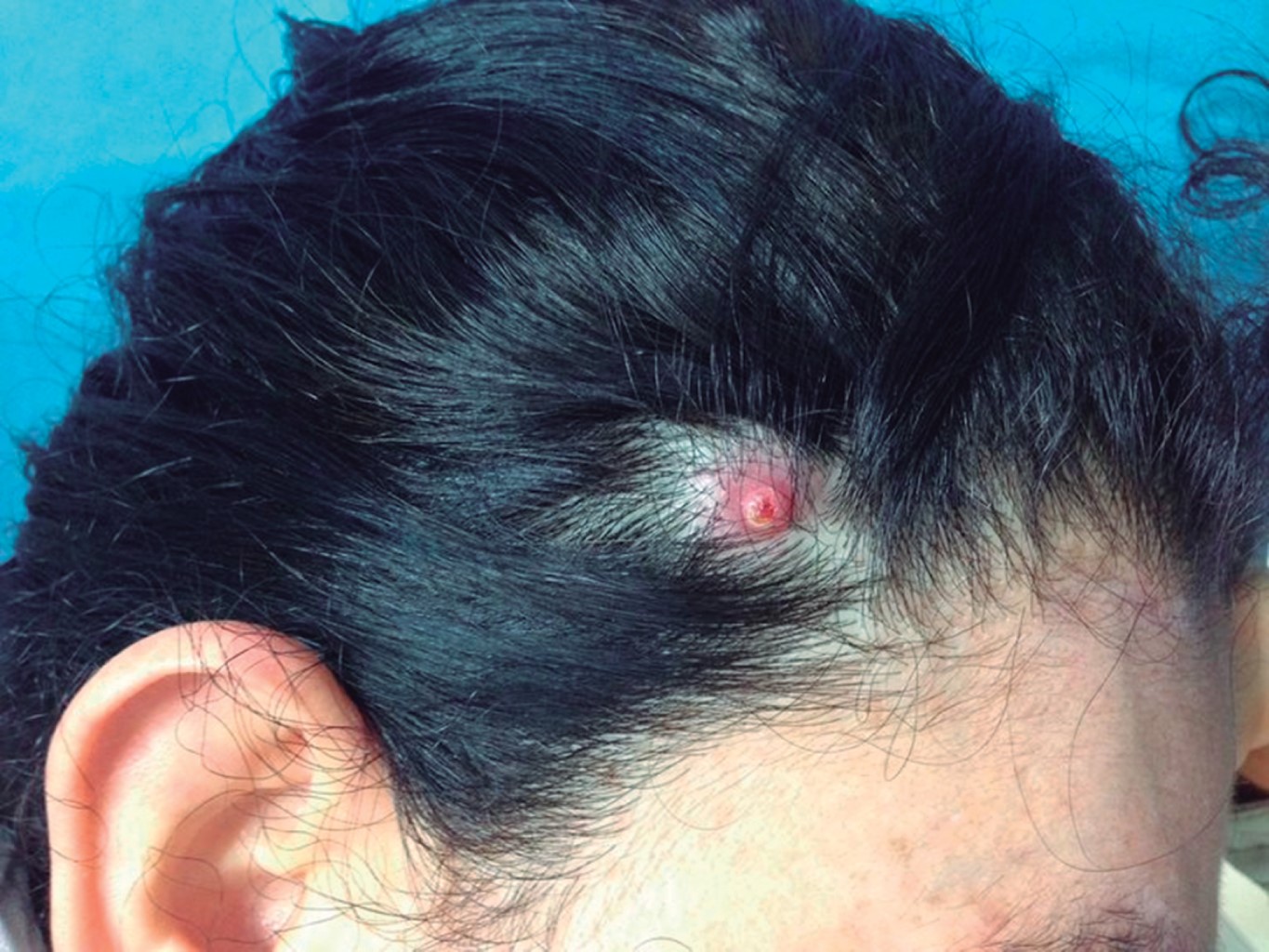 Se trata de una mujer de 46 años de edad, quien acudió por una dermatosis localizada en la cabeza, de la que afectaba la piel cabelluda en la región parietal derecha (Figura 1). La dermatosis estaba constituida por una neoformación exofítica de 2 × 2 cm, de aspecto quístico, eritemato-rosada, con áreas traslúcidas amarillentas, consistencia firme, bordes discretamente infiltrados y área queratósica en la superficie de seis meses de evolución, no dolorosa, pruriginosa ni friable (Figura 2).