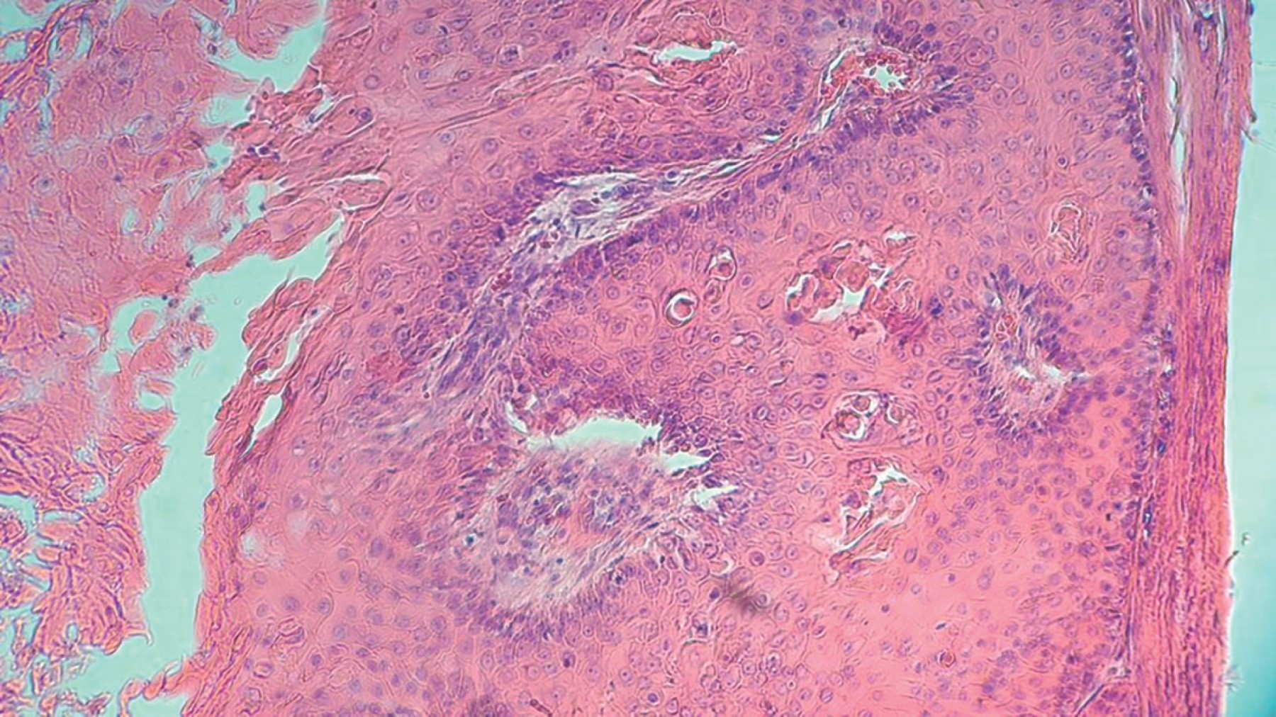 En las lesiones malignas se observan masas tumorales de aspecto sólido con nidos de células escamosas y queratinización abrupta de tipo pilar, con áreas de degeneración central, hemorragia, calcificación y necrosis multifocal, así como infiltración importante de la dermis con o sin extensión al tejido celular subcutáneo. Las células neoplásicas tienen núcleos pleomórficos, hipercromáticos y membranas nucleares irregulares con citoplasma amorfo y numerosas mitosis. En el centro del tumor hay queratina acelular eosinofílica, homogénea, con detritos necróticos.10 El estroma adyacente puede ser desmoplásico y mostrar infiltrado inflamatorio mononuclear.2,10