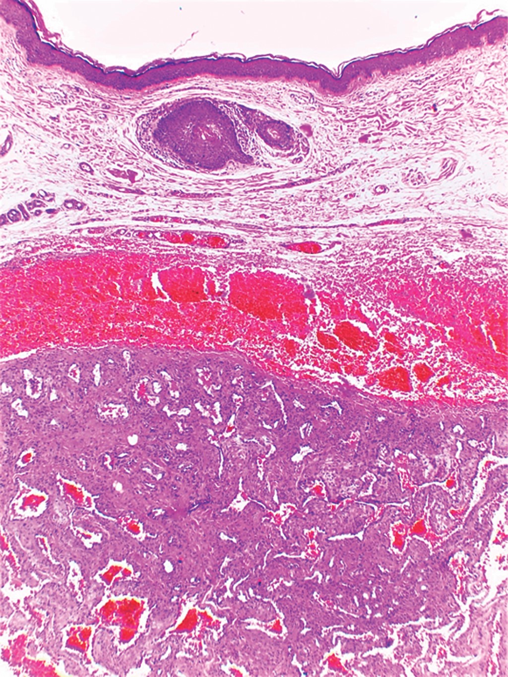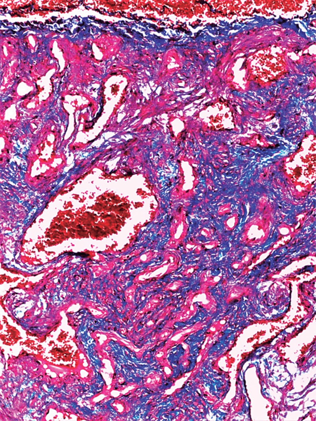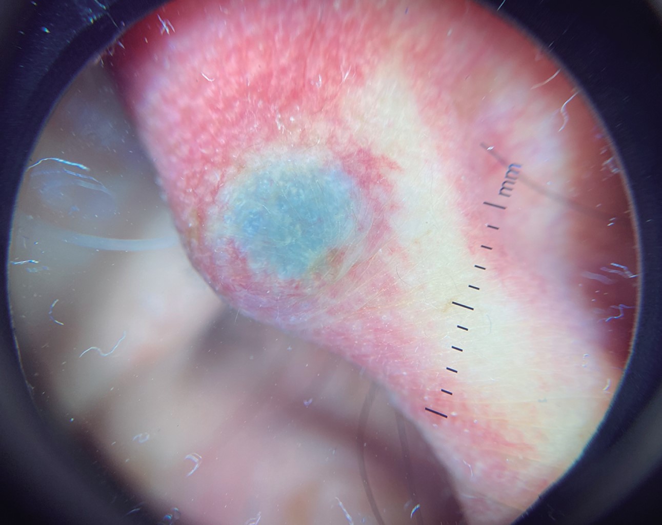 Se trata de un hombre de 69 años de edad, sin antecedentes de relevancia para el motivo de consulta, quien acude por presentar dermatosis localizada en cabeza, de la que afectaba pabellón auricular izquierdo a nivel de cara posterior del hélix, constituida por neoformación de 0.7 × 0.7 cm, hemiesférica, color azul-grisáceo, de superficie lisa, consistencia firme, bordes regulares, bien definidos; de dos años de evolución y sin síntomas asociados (Figura 1). A la dermatoscopía se observaron áreas azules sin estructura, con algunas zonas amarillentas y vasos lineales en la periferia (Figura 2). En el estudio histopatológico se observó epidermis con escasa capa córnea y tapones córneos. En la dermis superficial se observaron vasos dilatados rodeados por discretos infiltrados linfocitarios y zonas de edema entre las fibras de colágeno. En la dermis media y profunda se advierte la presencia de una neoformación circunscrita constituida por vasos dilatados y congestionados que se entremezclan con numerosas células fusiformes dispuestas en haces y que siguen diversos trayectos. La tinción tricrómica de Masson resultó positiva (Figuras 3, 4 y 5).