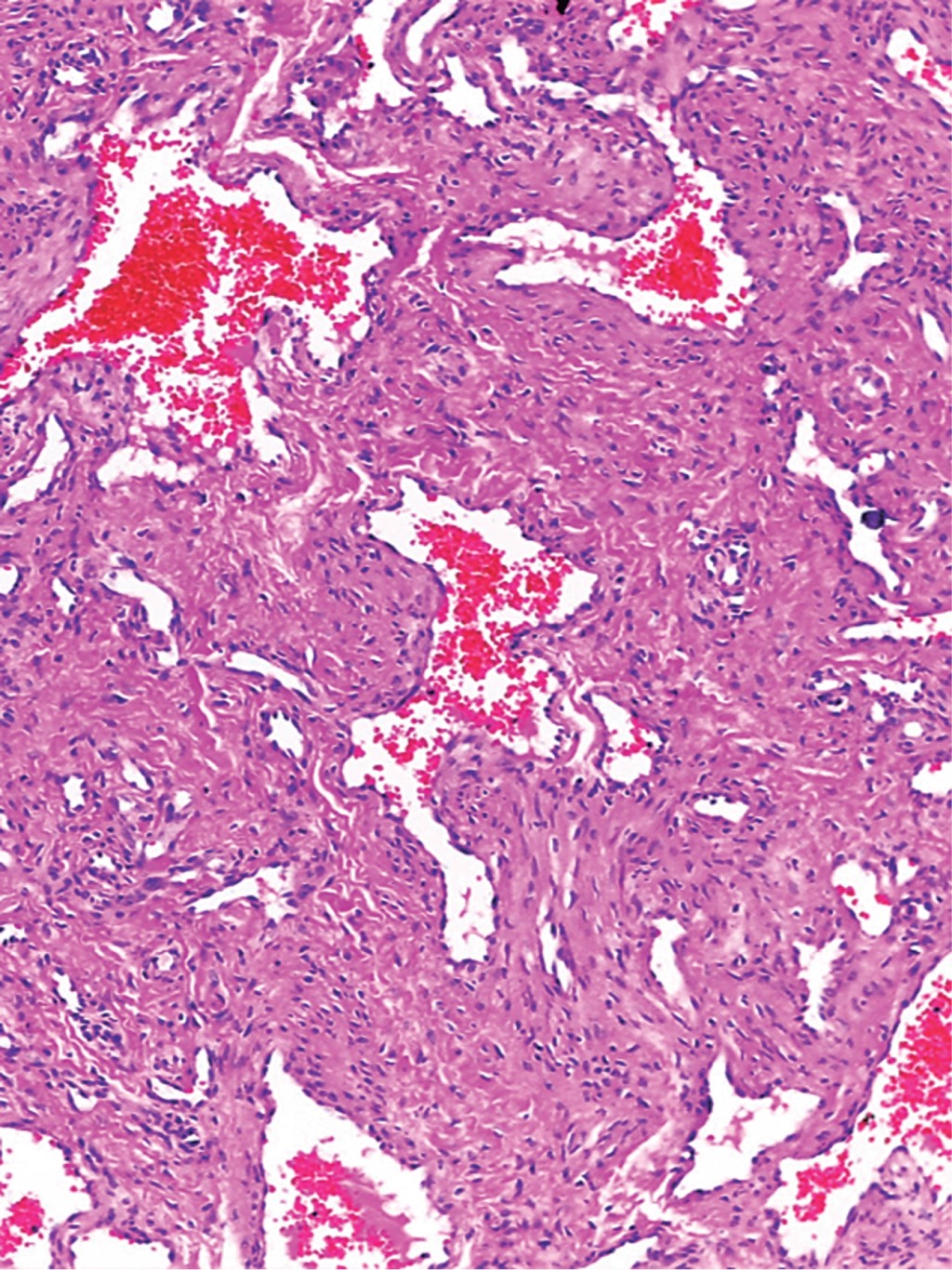 El abordaje diagnóstico puede incluir solicitar técnicas de imagen como el ultrasonido, que suele mostrar una masa ecogénica, homogénea, de bordes bien definidos y vascularizada.5,7 No obstante, estos hallazgos son inespecíficos y no permiten establecer el diagnóstico de forma certera, por lo que son necesarios la extirpación quirúrgica y el estudio histopatológico. Los hallazgos habituales con esta herramienta muestran una neoformación redonda, bien circunscrita, encapsulada, con haces de células musculares lisas entrelazadas y uniformes, distribuidas alrededor de vasos pequeños con paredes de calibre variable. Con frecuencia presentan degeneración mixoide, trombosis y calcificación distrófica.8 Con base en la morfología vascular, los angioleiomiomas pueden clasificarse en tres subtipos histopatológicos: sólido, venoso y cavernoso.9 En el venoso se observan vasos sanguíneos gruesos revestidos de músculo y haces de músculo liso intervascular.10 El sólido corresponde a 66% de los casos de angioleiomioma, seguido del venoso con 23% y el cavernoso con 11%.6