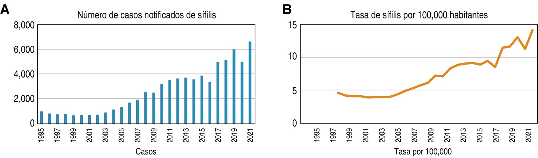En España, la Red Nacional de Vigilancia Epidemiológica (RENAVE) proporciona información sobre las ITS desde 1995, a partir de la obligatoriedad de la declaración de las mismas. Se observaron las tasas más bajas de sífilis en los años 2000-2001 (1.8 por 100,000 habitantes). Desde entonces, la incidencia de sífilis ha crecido anualmente, multiplicando hasta siete veces las cifras de 2000-2001 según el último informe disponible en 2021 (14.0 por 100,000 habitantes) (Figura 2).3