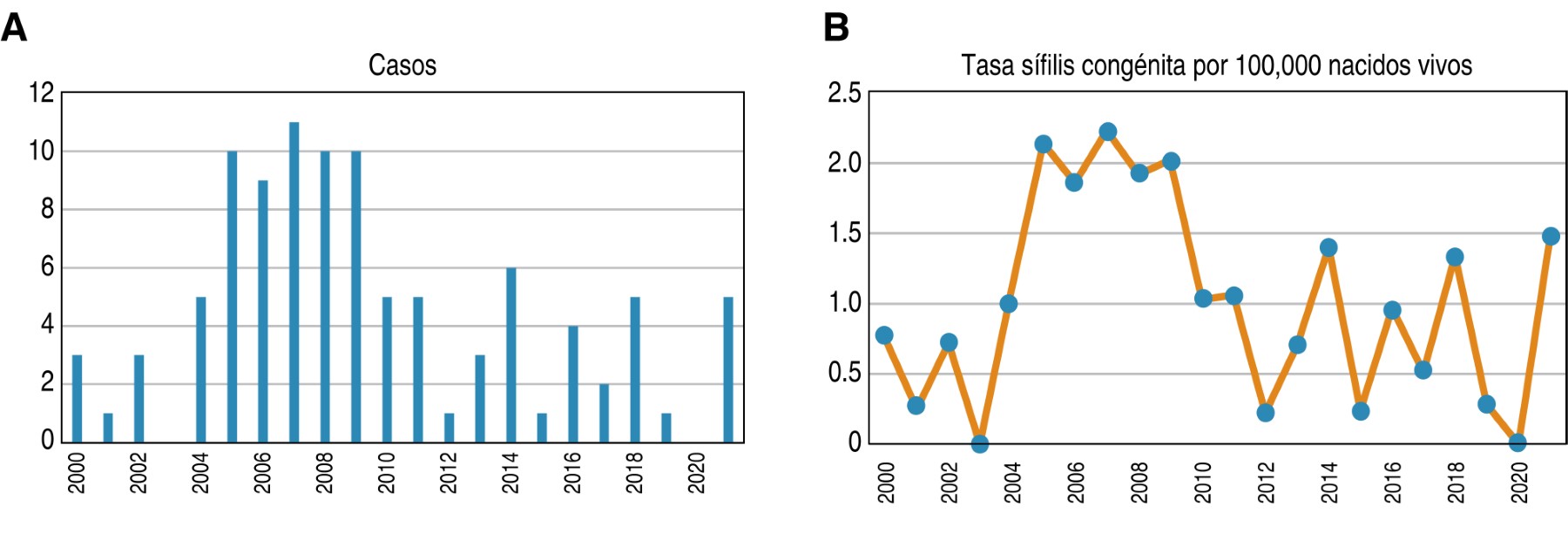 La sífilis es una infección, fundamentalmente de transmisión sexual, causada por la bacteria Treponema pallidum y que constituye un importante problema de salud pública en todo el mundo, con una incidencia global en aumento. Este hecho contribuye a que las tasas de sífilis congénita sean elevadas en países de renta baja y mediana, y estén resurgiendo en algunos países de alta renta en los últimos años. A pesar de ello el conocimiento sobre la carga de enfermedad de sífilis en la embarazada y la sífilis congénita es limitado. Es necesario reforzar los sistemas de salud para que garanticen acceso al cribado y tratamiento de todas las gestantes, sus hijos y sus parejas sexuales, así como fortalecer las redes de vigilancia para abordar eficazmente las intervenciones en la sífilis congénita.ABREVIATURAS: