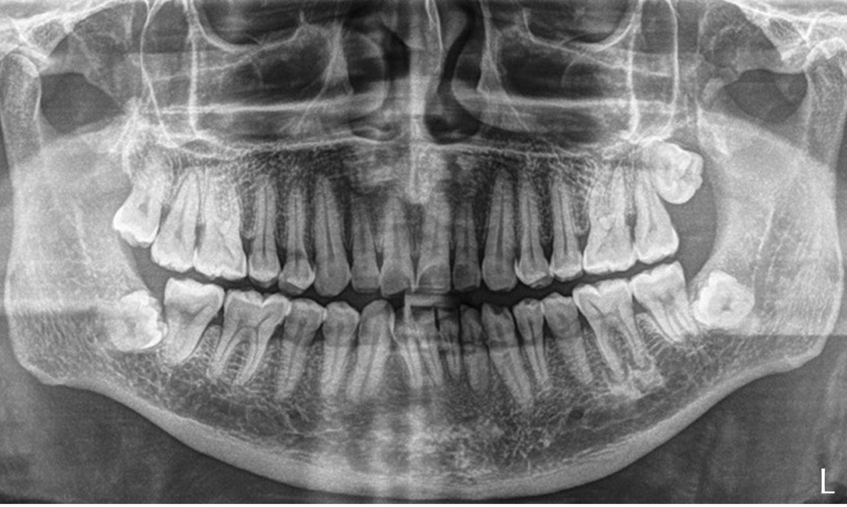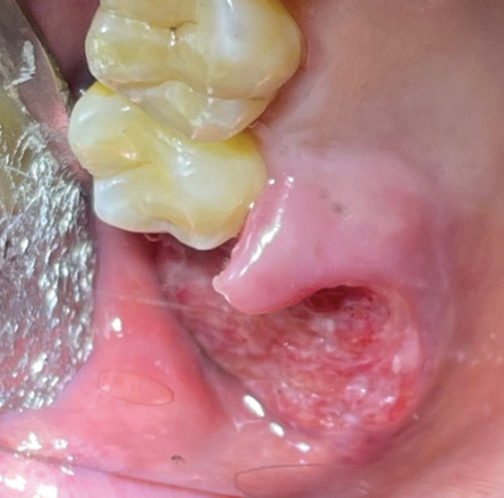 El paciente inicia su padecimiento alrededor de noviembre y diciembre de 2022, notando un aumento de volumen en la zona del molar 28. De manera posterior, en diciembre de 2022, el paciente refiere inflamación, sangrado espontáneo y dolor moderado, por lo que acudió al servicio odontológico externo y se le prescribió clindamicina de 300 mg vía oral, cada 8 horas y ketoprofeno de 100 mg vía oral, cada 8 horas, con mejoría parcial del dolor, persistiendo el sangrado espontáneo, por lo que acude a consulta privada. Paciente con signos vitales estables, a la exploración de cavidad oral se identifica una úlcera de bordes indurados en maxilar adyacente a la zona del molar 28, de un aproximado de 2 × 2 cm, de consistencia firme y asintomático a la palpación (Figura 1).