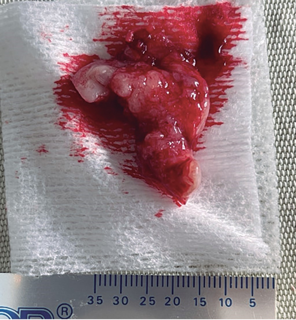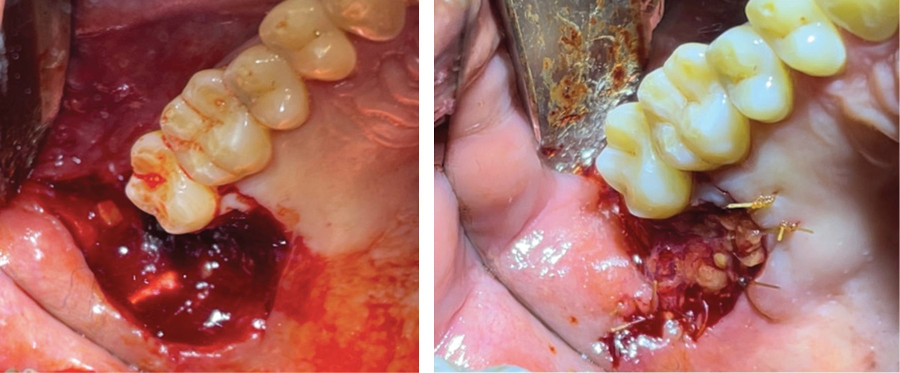 Se realiza biopsia escisional y exodoncia del molar 28, en la misma intervención, en enero de 2022 (Figuras 3 y 4). No se suspende medicación de clindamicina hasta finalizar el esquema y se prescriben analgésicos y una dosis única de betametasona inyectable, vía intramuscular 8.0 mg/2 mL.