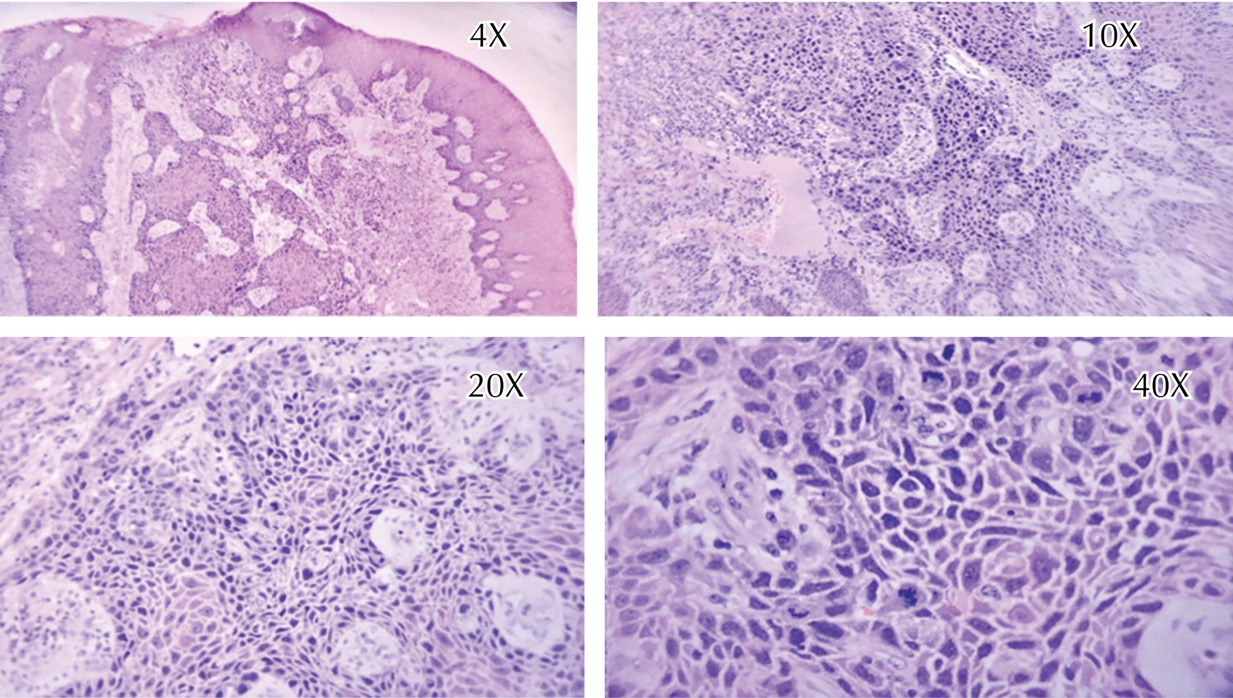 El espécimen está formado por islas de epitelio escamoso estratificado con displasia severa que infiltra el tejido conectivo fibroso denso, bien vascularizado disqueratosis, con infiltrado inflamatorio crónico leve difuso, hemorragia reciente, glándulas salivales mucosas, conductos estriados, músculo estriado. Revestido por epitelio escamoso estratificado paraqueratinizado con edema intracelular y solución de continuidad con fibrina e infiltrado inflamatorio mixto severo difuso. No presenta bordes sanos (Figura 5).