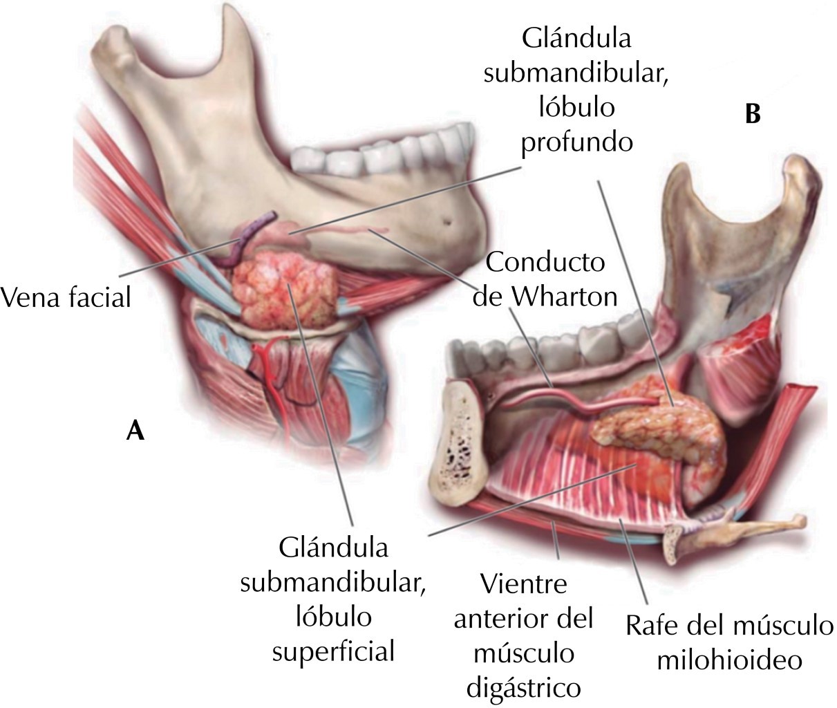 La glándula submandibular consta de un lóbulo superficial más grande que se encuentra dentro del triángulo digástrico en el cuello y un lóbulo profundo más pequeño que se encuentra dentro del piso de la boca posteriormente.2 La glándula se enrolla detrás del músculo milohioideo y se extiende hacia la cavidad oral, pudiendo estar en íntima relación o en continuidad con la glándula sublingual.4 El grupo de ganglios linfáticos submandibulares están en contacto con la glándula o suelen estar incrustados en ella, así como la arteria facial que gira alrededor de la glándula submandibular. El nervio lingual pasa por debajo del conducto de Wharton y forma un bucle alrededor de su aspecto exterior antes de insertarse en la mucosa lingual.7 El conducto submandibular surge en el lóbulo superficial (Figura 1) y emerge de la superficie medial de este lóbulo justo detrás del borde posterior del músculo milohioideo.2 El conducto de Wharton mide 5 cm de largo y alrededor de 2 a 4 mm de diámetro.4 El largo, tortuoso y ascendente camino del conducto submandibular puede ser responsable de su mayor tendencia a formar cálculos salivales,3 debido a que las secreciones salivales tienden a viajar contra la gravedad y hay mayores posibilidades de retención.7