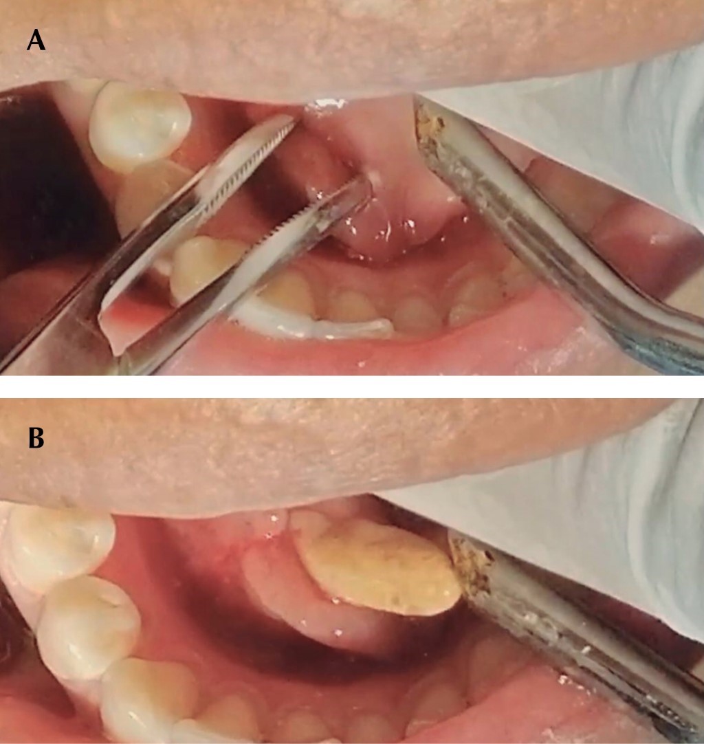 Previa infiltración de lidocaína 2% 1:100,000 haciendo bloqueo nervioso del nervio lingual, después se realizó una incisión lineal de 1 cm en la porción más prominente del sialolito sobre la mucosa, medial y paralela al trayecto del conducto de Wharton y del nervio lingual (Figura 4). Mediante unas pinzas mosquito (Halsted) se llevó a cabo la disección roma en dirección al sialolito la cual generó la expulsión del mismo en su totalidad fuera del conducto submandibular (Figura 5). Se realizó maniobra de digitopresión para ordeñar la glándula, con la finalidad de drenar la saliva estancada en el conducto submandibular, al momento de realizarla se observó salida de material purulento (Figura 6). Se efectuó la limpieza del lecho quirúrgico mediante irrigación con solución electrolizada de superoxidación. Se suturó la herida con Vicryl 4-0 mediante dos puntos simples (Figura 7). Por último se volvió a hacer la maniobra de digitopresión para observar la adecuada permeabilidad de la carúncula. La sialolitotomía se llevó a cabo sin complicaciones. En el postoperatorio inmediato se recetó antibiótico y analgésicos antiinflamatorios. La paciente fue citada siete días después de la intervención quirúrgica para su revisión postoperatoria. A la exploración no había presencia de inflamación extraoral, así como ausencia de infección, dolor, sangrado y dehiscencia de la herida quirúrgica (Figura 8).