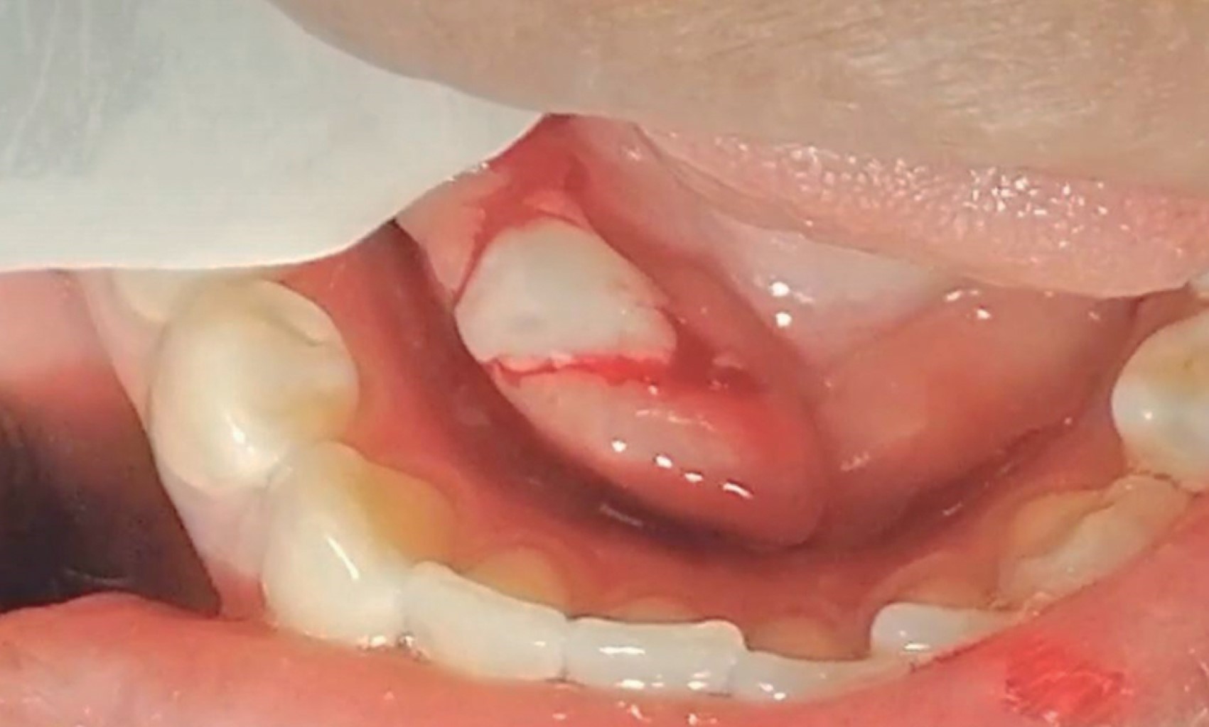 Se presenta paciente femenino de 37 años de edad, con antecedentes patológicos personales y heredofamiliares negados, su motivo de consulta "inflamación en piso de boca". La paciente refiere aumento de volumen en piso de boca de lado derecho de cinco días de evolución, asimismo ardor y dolor al comer. Acude al médico general el cual prescribe antibiótico y analgésicos con un presunto diagnóstico de absceso, la paciente no presentó mejoría asociada a dicha terapéutica médica. A la exploración clínica extraoral, durante la inspección se aprecia una asimetría asociada a un aumento de volumen en la región submandibular (triángulo digástrico), a la palpación se percibe dicho aumento indurado y la paciente refiere dolor. De forma intraoral se aprecia un aumento de volumen de 3 cm en el piso de boca, asociado al conducto de Wharton del lado derecho, con una mucosa inflamada, eritematosa, con un punto blanco compatible con una fístula. A la palpación se encuentra indurado y con dolor (Figura 2). En la maniobra de digitopresión para ordeñar la glándula submandibular, se pudo apreciar salida de escaso material purulento el cual drenaba a través de la fístula, sin permeabilidad ni drenaje de la carúncula. La radiografía panorámica demostró un área radiopaca de forma ovalada en el piso de la boca, cerca de los cuellos de los premolares y en la región de los dientes anteriores inferiores. Se solicitó una tomografía computarizada para una mejor delimitación de la lesión, la cual reveló un cuerpo hiperdenso de alrededor de 30 mm en la región submandibular derecha (Figura 3). Los hallazgos clínicos e imagenológicos llevaron al diagnóstico de sialolito asociado al conducto submandibular. Debido al tamaño y la localización del cálculo, se optó por la extirpación quirúrgica del sialolito de manera ambulatoria con la preservación de la glándula submandibular.