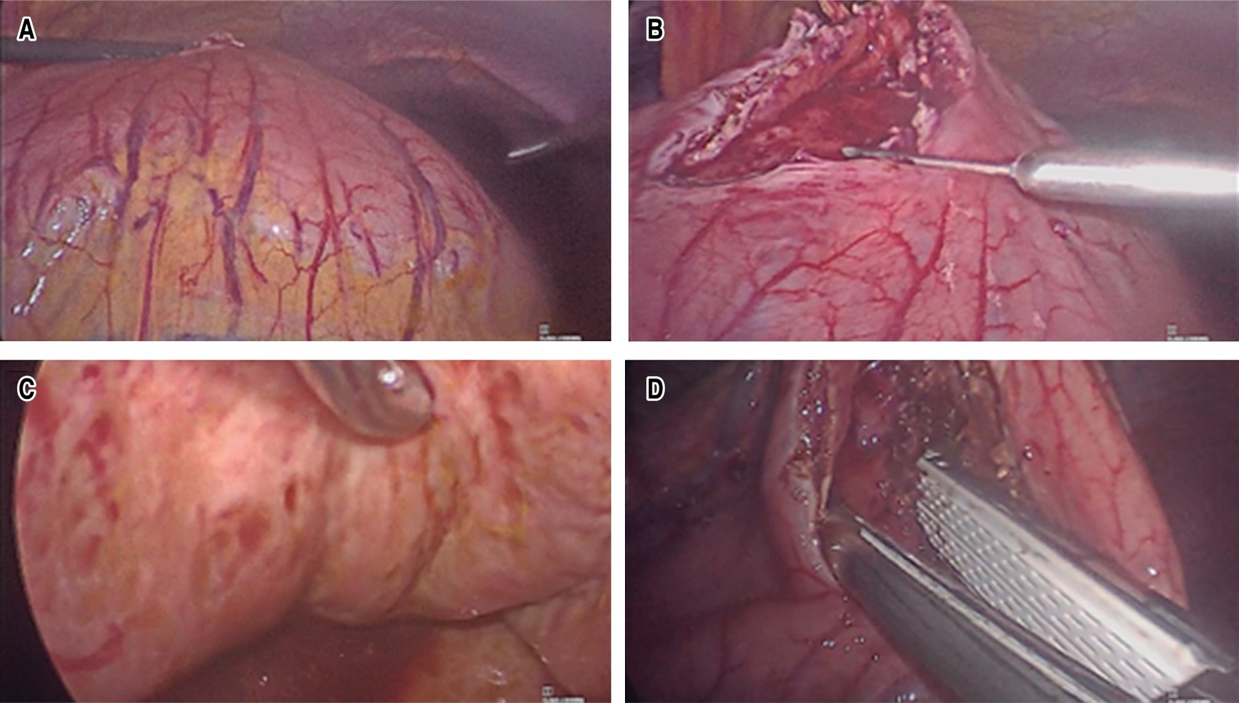 Previo consentimiento informado, se realiza laparoscopia en la cual se observa estómago abombado y desplazado por tumor retrogástrico (pseudoquiste) aproximadamente de 200 × 180 × 170 mm, vesícula biliar Parkland 2, hígado macroscópicamente normal, resto sin alteraciones. Se procede a realizar cistogastroanastomosis con engrapadora Endo GIA, obteniendo salida de abundante líquido de aspecto herrumbroso, se aspira líquido de pseudoquiste pancreático aproximadamente 2,000 cm3. Se revisa cavidad de pseudoquiste y se encuentra escaso tejido necrótico, se realiza debridación roma de tejido necrótico con gasa, se drena líquido del pseudoquiste pequeño y se obtiene aproximadamente 200 cm3 de líquido. Se realiza cierre de gastrostomía anterior en dos planos y se verifican fugas. Posteriormente, se realiza colecistectomía laparoscópica de manera convencional, se avocan drenajes tipo Penrose hacia lecho vesicular y proximal a la gastrostomía (Figura 4).