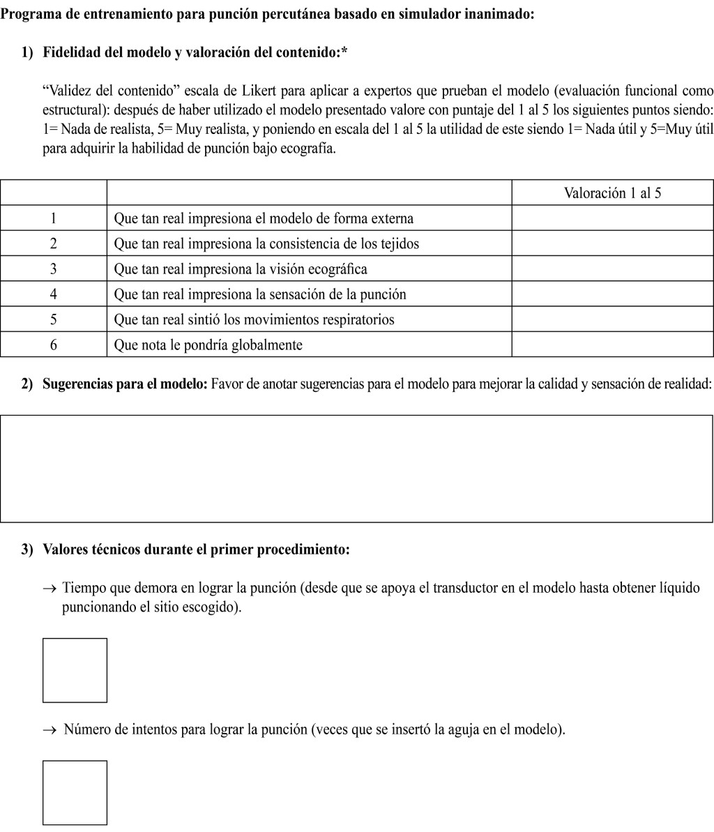 Validez del contenido: en la encuesta a expertos se obtuvo una mediana de 4 puntos para la utilidad del modelo de punción guiada por ecografía (DE 0.2), mientras que para el realismo se obtuvo una mediana de 3.5 (DE 0.49).
